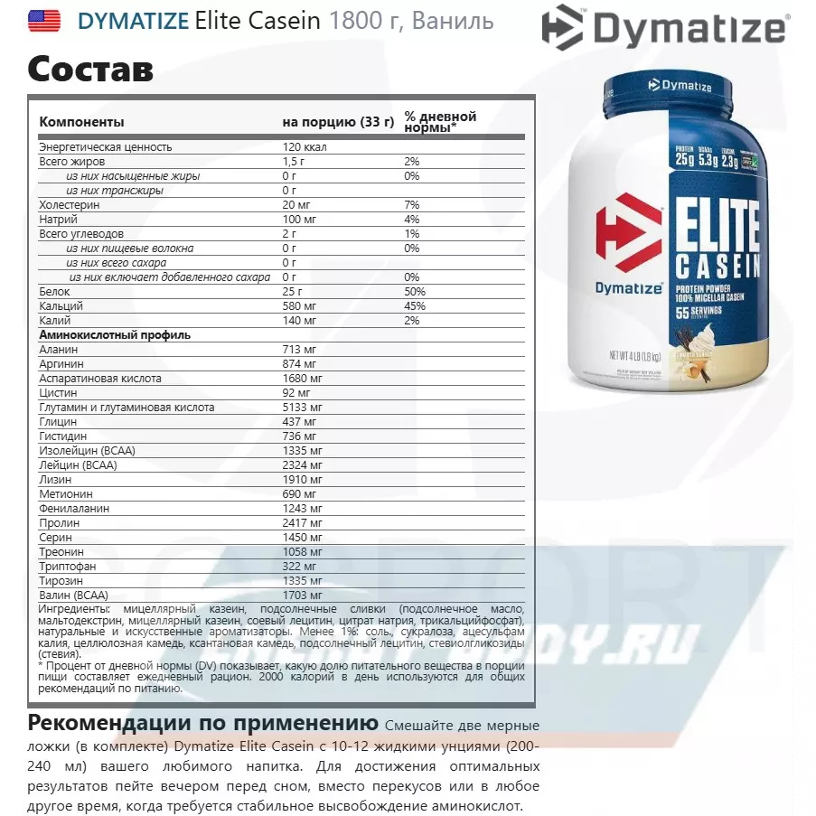 Dymatize Elite Casein – качественная белковая добавка в основе которой содержится казеин. Каждая порция содержит 24 грамма медленно усвояемого казеинового протеина, давая мышцам все необходимое для запуска процесса построения новой мышечной ткани. В случае, когда вы долго обходитесь без еды, именно казеин способен поддерживать ваш организм, обеспечивая, его в течение долгого периода времени аминокислотами и другими питательными микроэлементами. Медленное переваривание казеина вызвано его pH чувствительностью в пищеварительном тракте, в результате которого и происходит длительное усвоение белка.