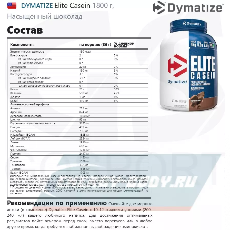 Рекомендации по применению Смешайте две мерные ложки (в комплекте) Dymatize Elite Casein с 10-12 жидкими унциями (200-240 мл) вашего любимого напитка. Для достижения оптимальных результатов пейте вечером перед сном, вместо перекусов или в любое другое время, когда требуется стабильное высвобождение аминокислот.
