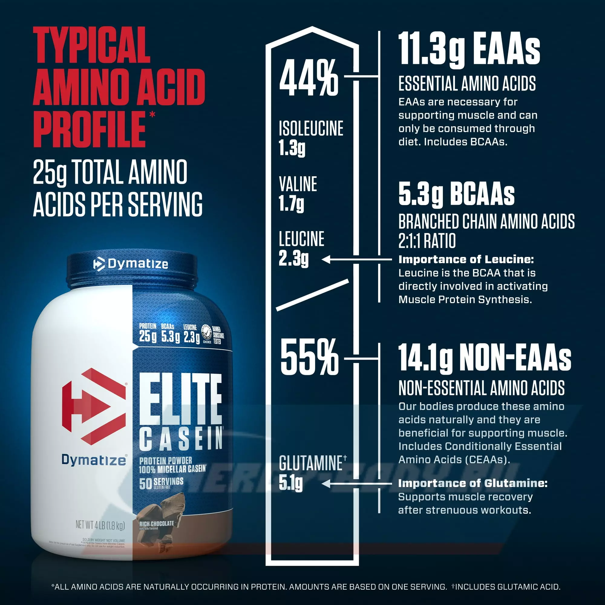 Dymatize Elite Casein – качественная белковая добавка в основе которой содержится казеин. Каждая порция содержит 24 грамма медленно усвояемого казеинового протеина, давая мышцам все необходимое для запуска процесса построения новой мышечной ткани. В случае, когда вы долго обходитесь без еды, именно казеин способен поддерживать ваш организм, обеспечивая, его в течение долгого периода времени аминокислотами и другими питательными микроэлементами. Медленное переваривание казеина вызвано его pH чувствительностью в пищеварительном тракте, в результате которого и происходит длительное усвоение белка.