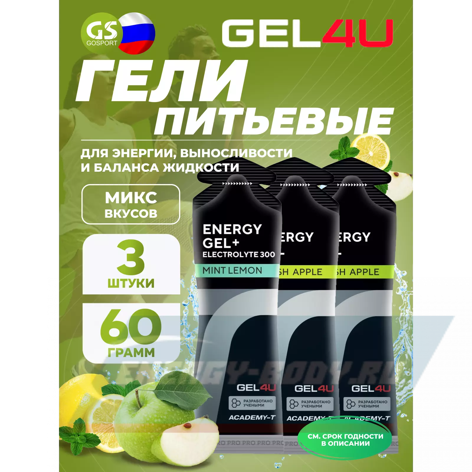 Energy Gel MIX 3 x 60 г, Яблоко, Лимон и Мята