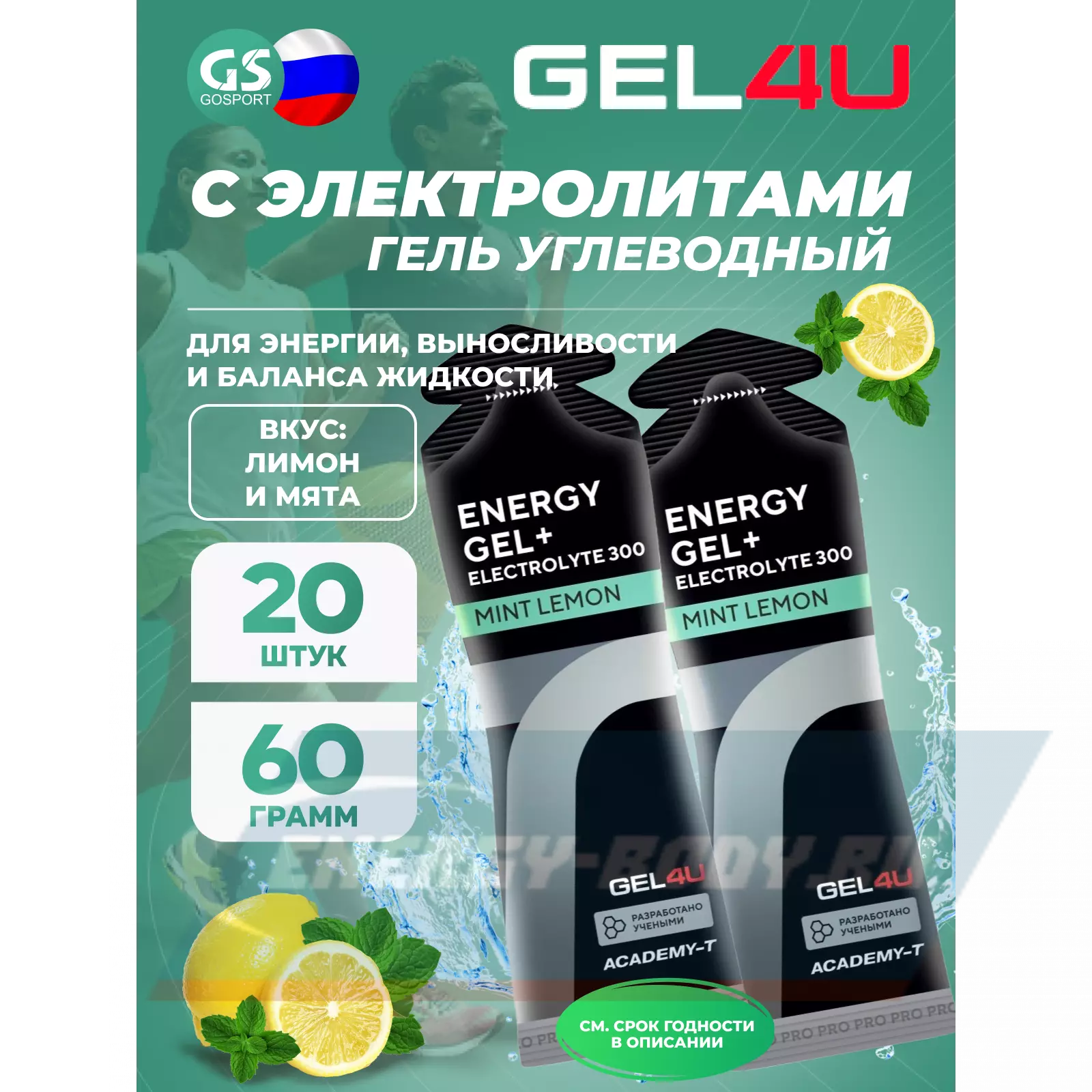 GEL4U Energy GEL + Electrolyte 300 20 x 60 г, Лимон и Мята — Энергия, выносливость и баланс жидкости