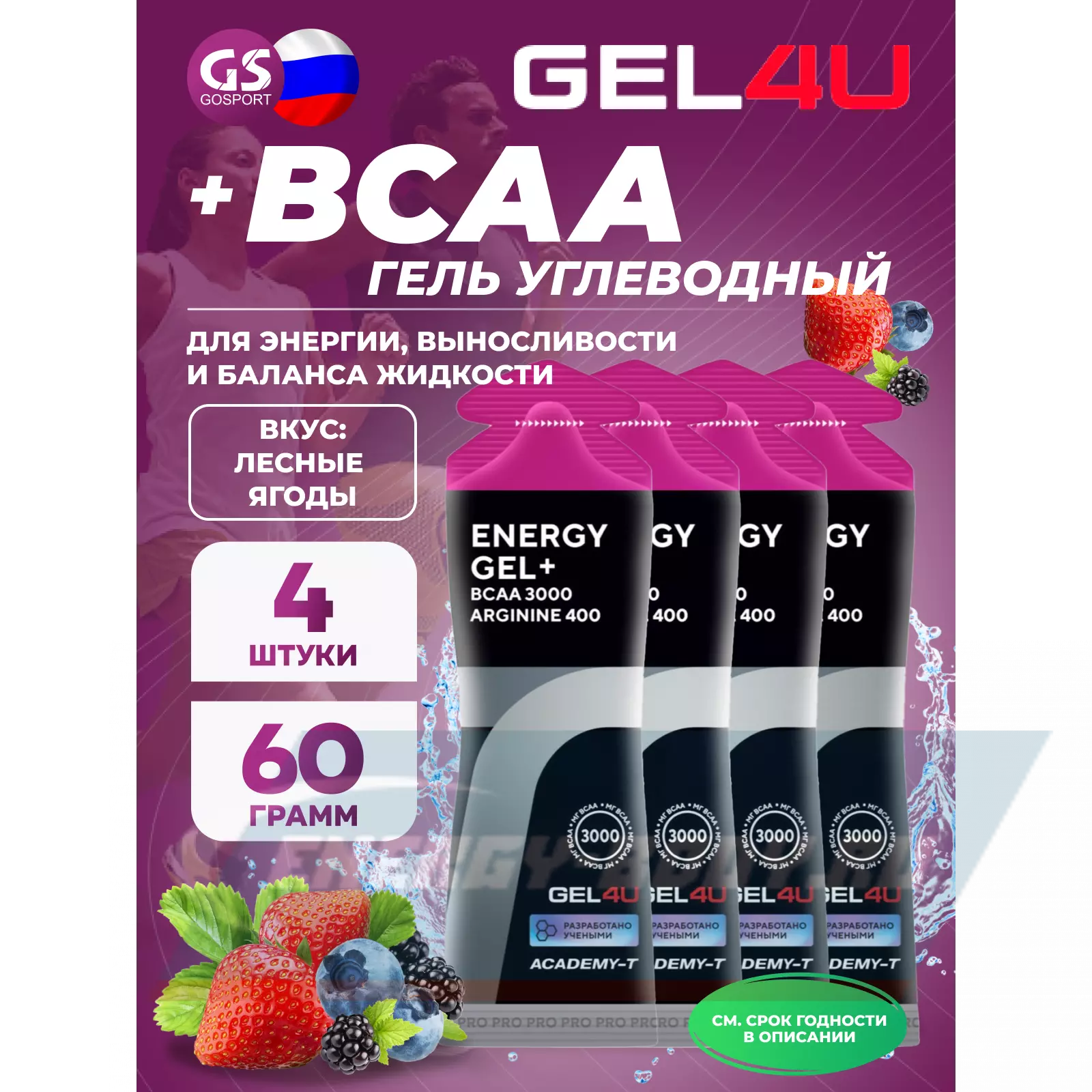 GEL4U BCAA Гель Энергетический 4 x 60 г, Лесные ягоды — Энергия, выносливость и баланс жидкости