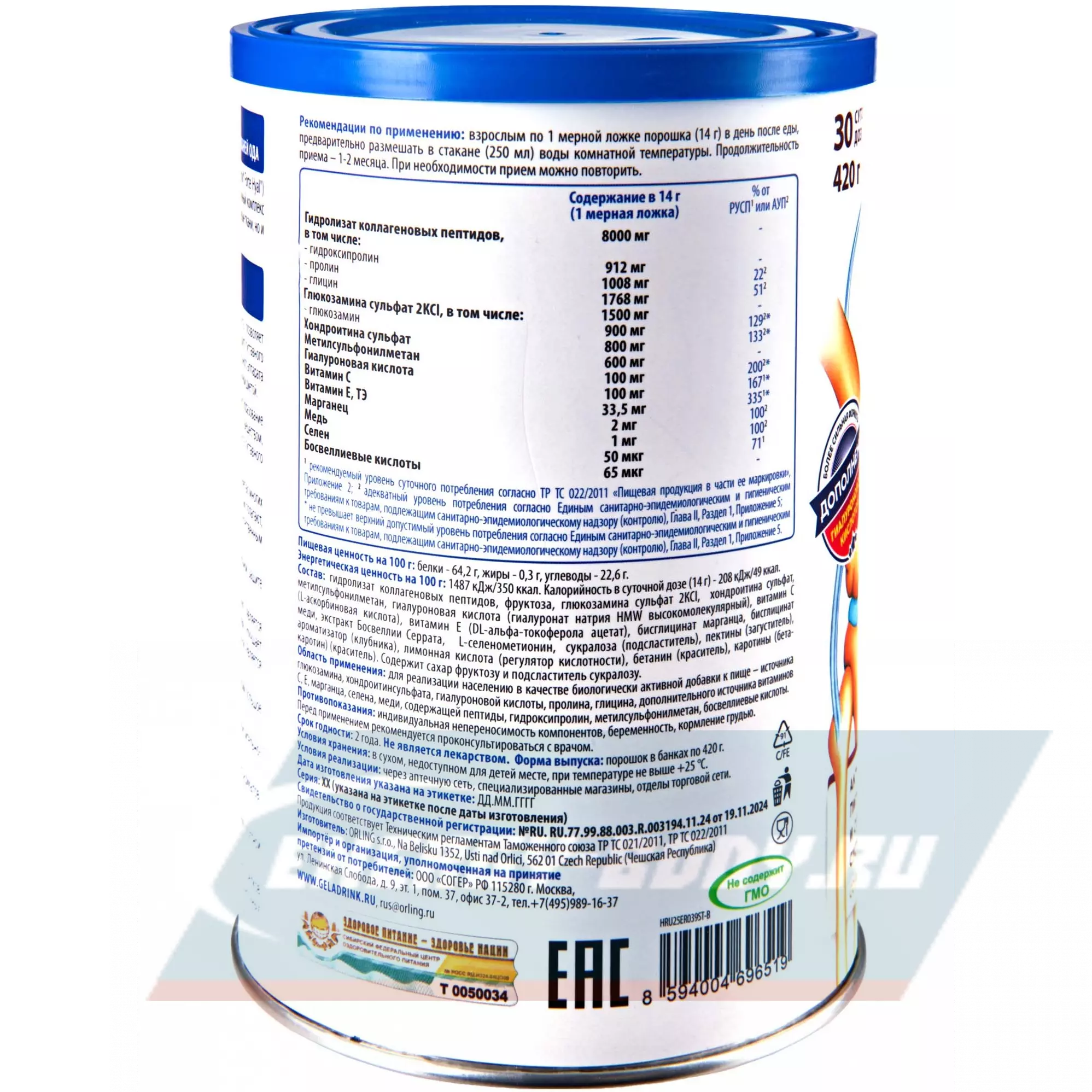 Активное многокомпонентное питание соединительных тканей суставов и позвоночника. Усовершенствованная формула Геладринк. Помимо оптимального количества хондропротекторов содержит усиленную дозу гиалуроновой кислоты и суточную дозу меди, которые способствуют регенерации и улучшению подвижности, амортизации и гибкости суставов, защищают кожу от вялости и старения, а волосы от преждевременной седины.