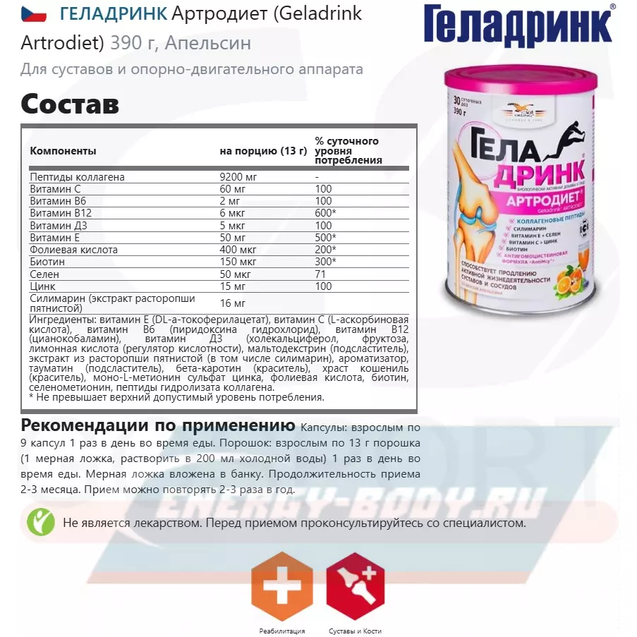 Геладринк® Артродиет® («Geladrink® Artrodiet®») содержит оптимальный комплексный состав для питания суставов, позвоночника и сосудов и продления их активной жизнедеятельности. Область применения: в качестве биологически активной добавки к пище, содержащей коллаген, дополнительного источника витаминов (С, В6, В12, Д3, Е, фолиевой кислоты, биотина), селена, цинка, источника флавоноидов.лее клинические исследования, табличка с составом и описание состава.