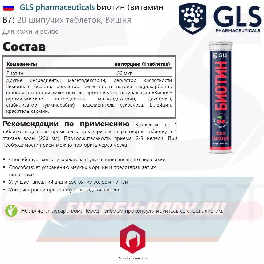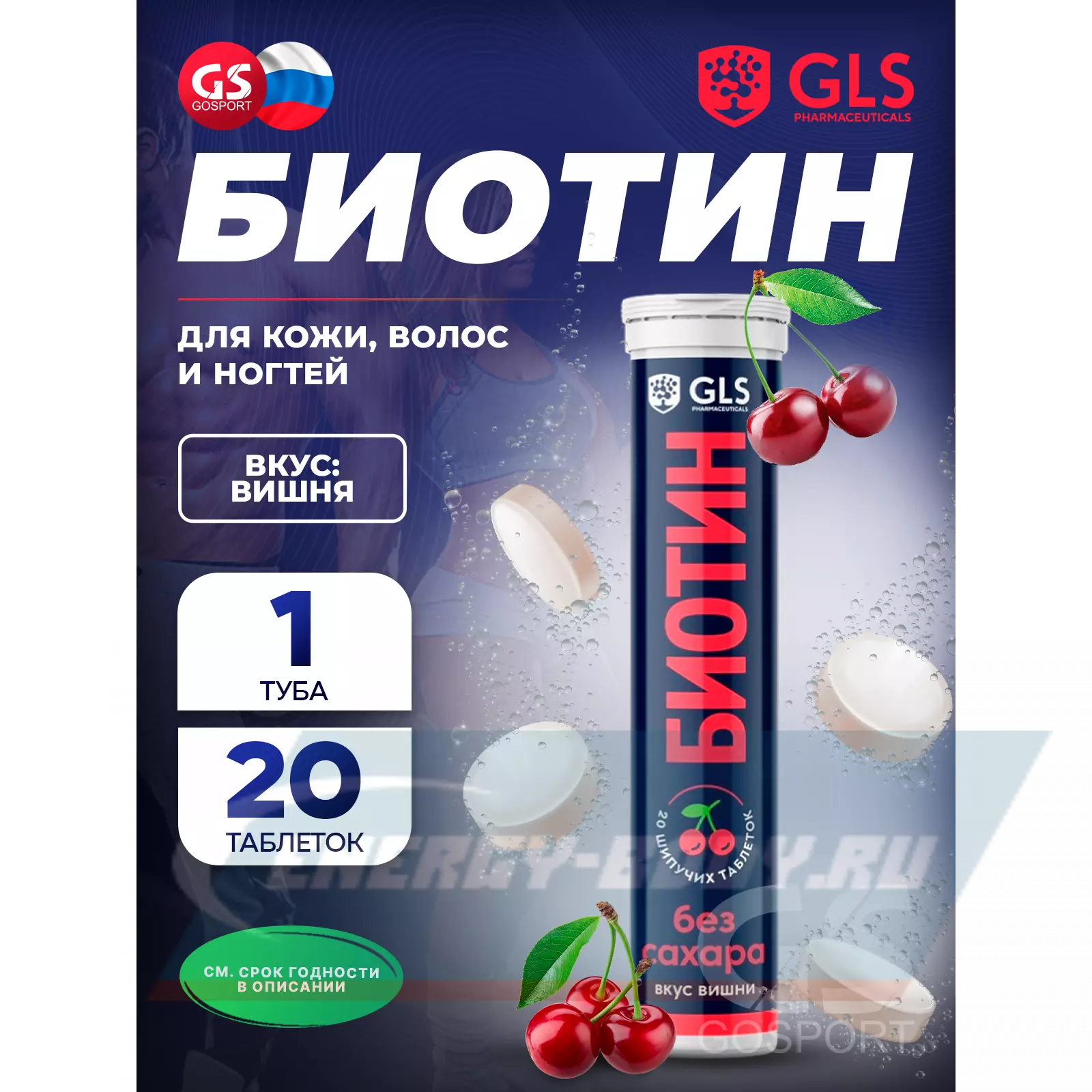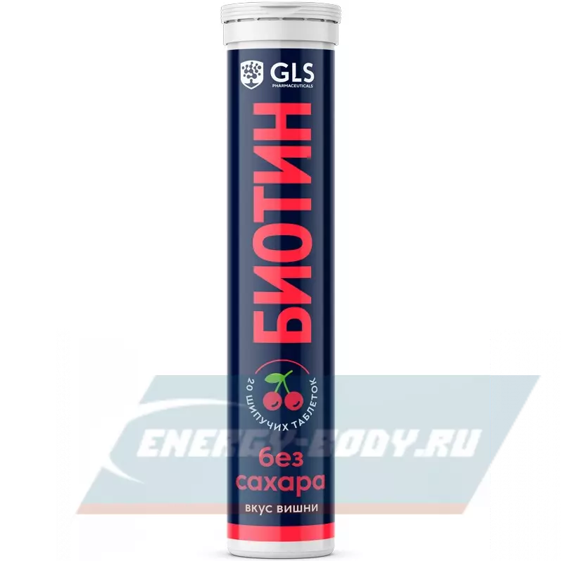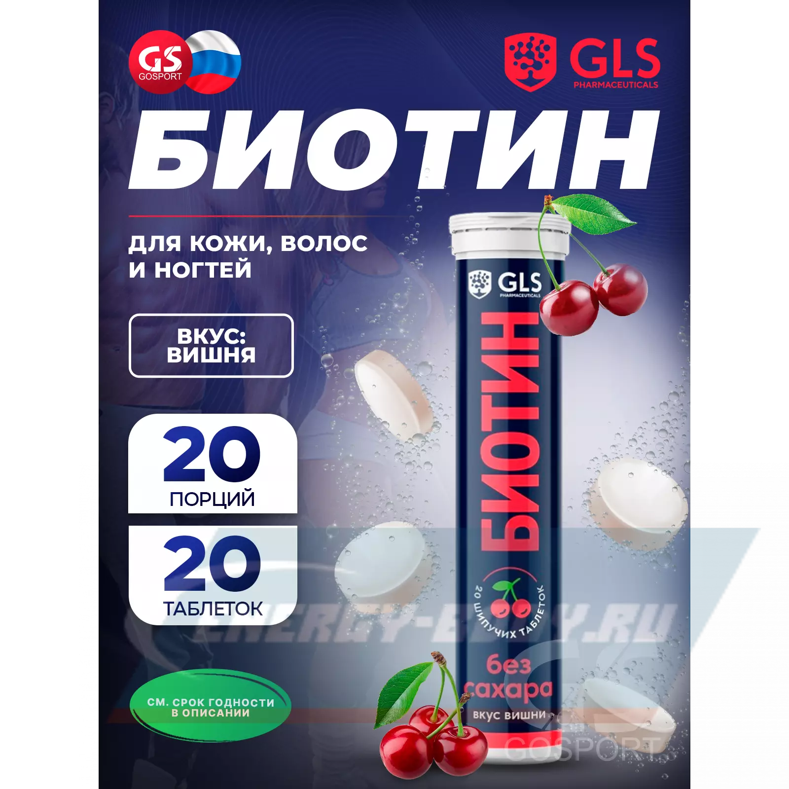 GLS pharmaceuticals Биотин (витамин В7) 20 шипучих таблеток, Вишня — для волос, ногтей и кожи