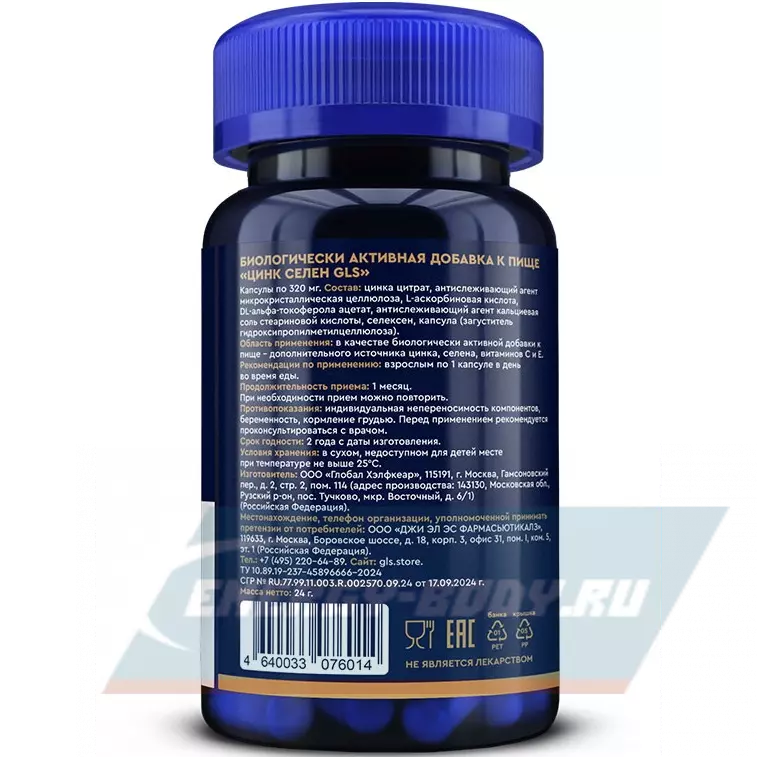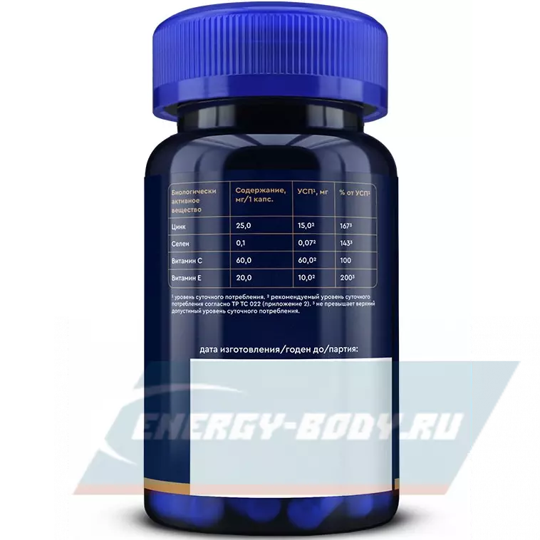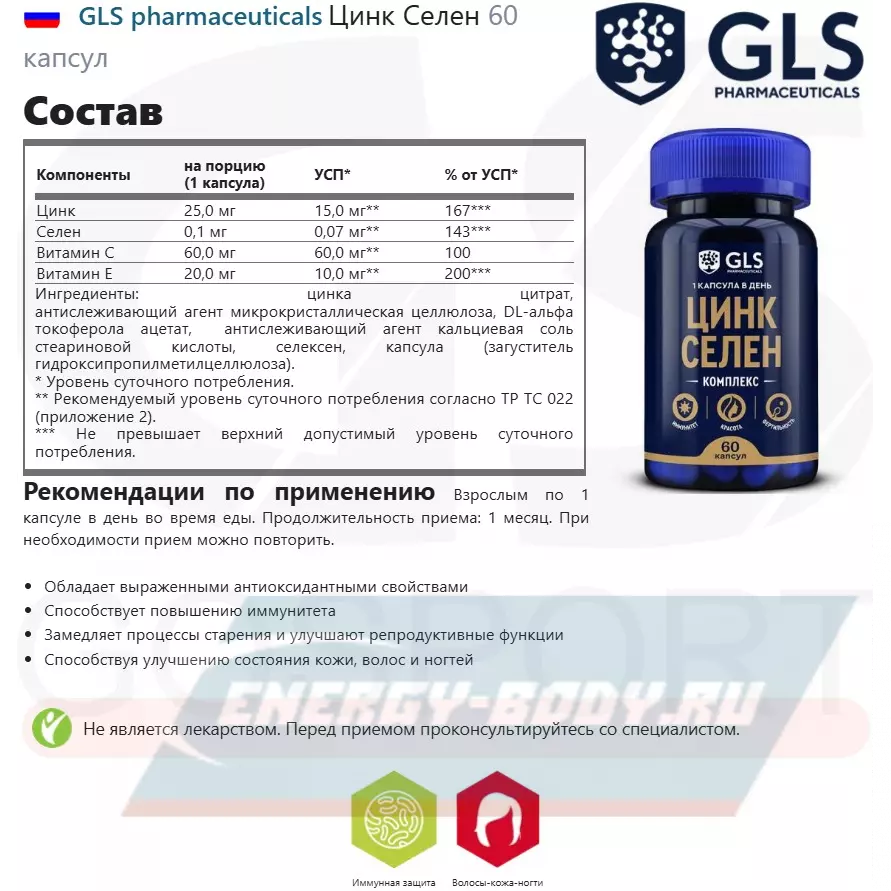 Ингредиенты: цинка цитрат, антислеживающий агент микрокристаллическая целлюлоза, DL-альфа токоферола ацетат, антислеживающий агент кальциевая соль стеариновой кислоты, селексен, капсула (загуститель гидроксипропилметилцеллюлоза).