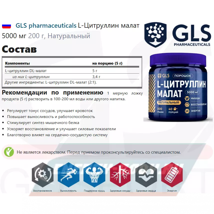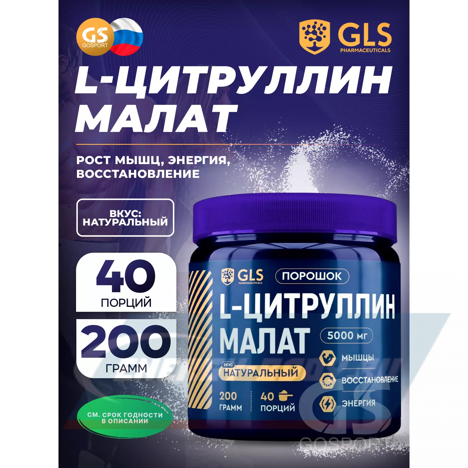 GLS pharmaceuticals L-Цитруллин малат 5000 мг 200 г, Натуральный — Для роста мышц, энергии и восстановления