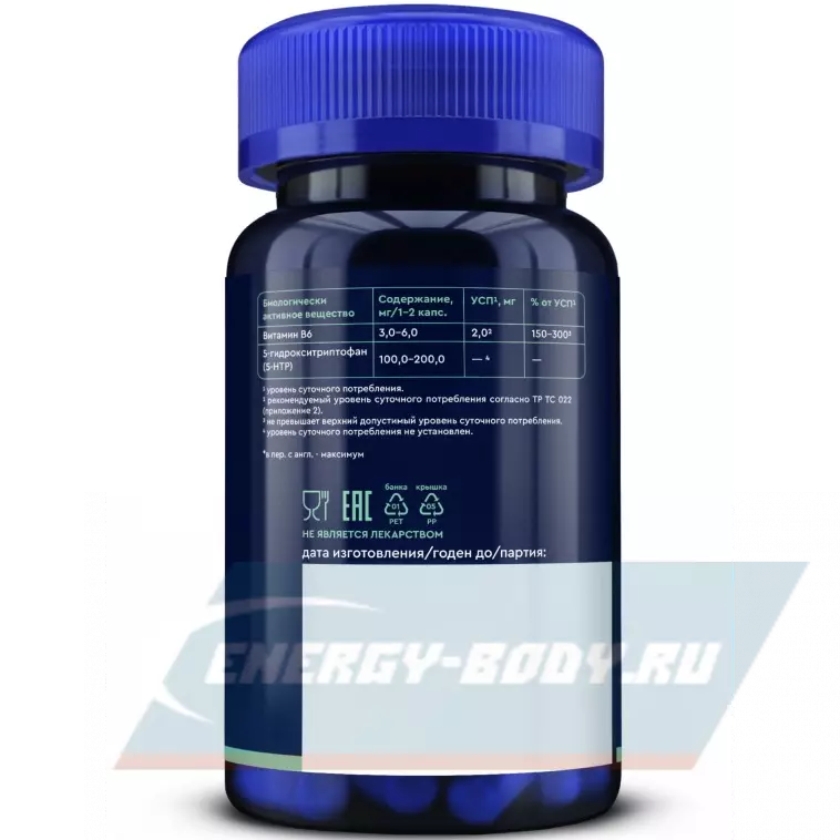 Ингредиенты: антислеживающий агент микрокристаллическая целлюлоза, 5-гидрокситриптофан (5-НТР), антислеживающий агент кальциевая соль стеариновой кислоты, пиридоксина гидрохлорид, капсула (желатин).