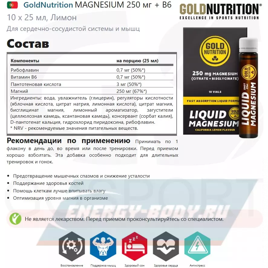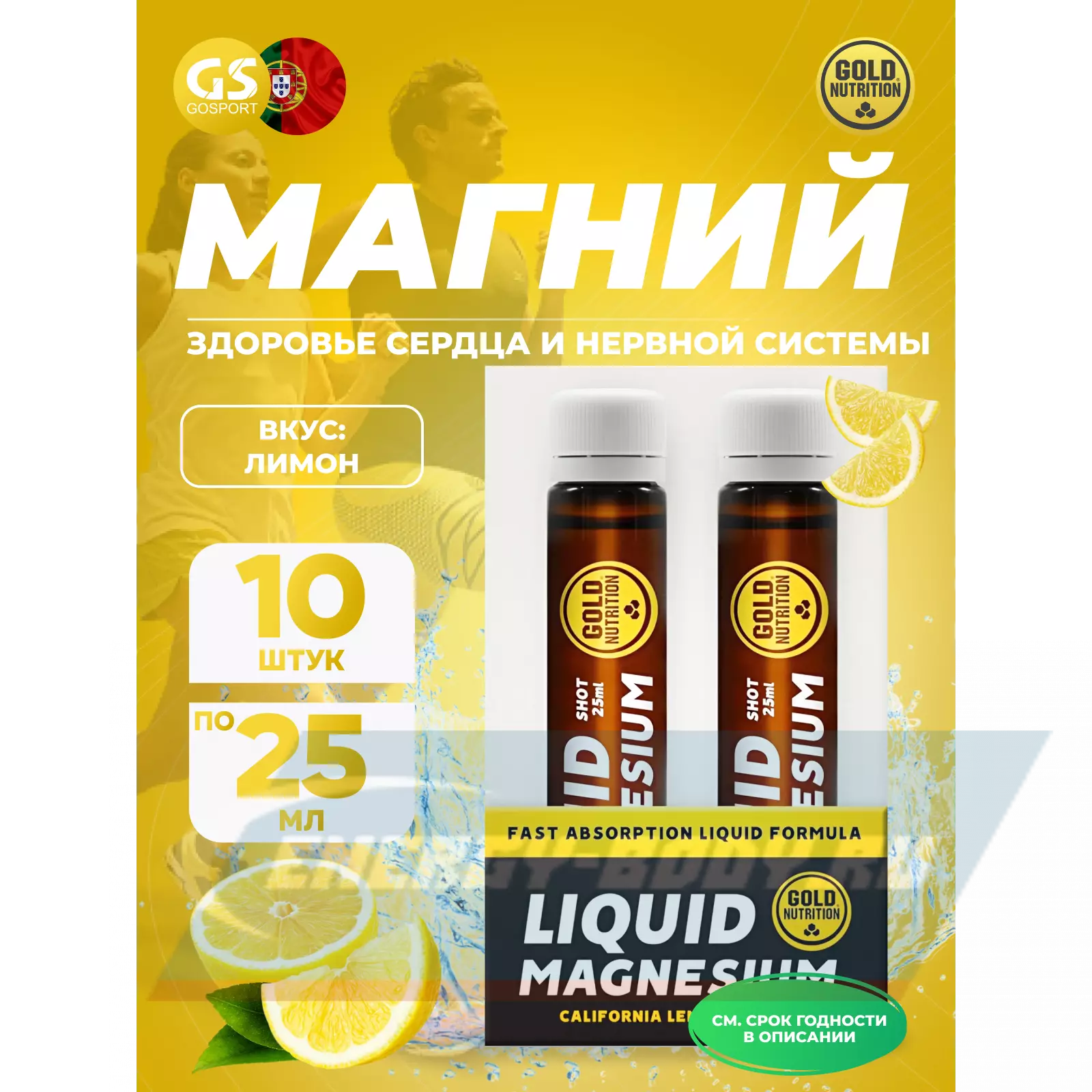 GoldNutrition MAGNESIUM 250 мг + B6 10 x 25 мл, Лимон — Для сердечно-сосудистой системы и мышц