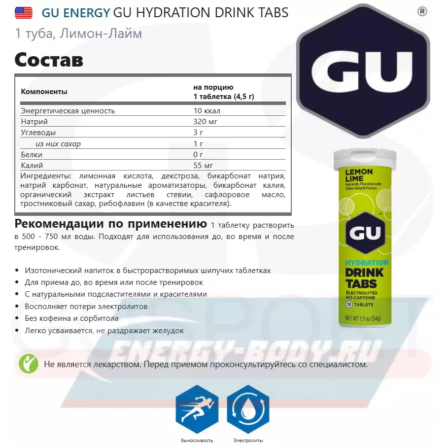 Hydration Drink Tabs от GU - это быстро растворимые шипучие таблетки, предназначенные для приготовления до 500 мл изотонического напитка, состав которого поможет нормализовать уровень электролитов в теле. Благодаря сохранению оптимального уровня гидратации, мы обеспечиваем условия, при которых организм может легче справляться с длительными физическими нагрузками. Следует также отметить, что данный изотоник характеризуется щадящим действием на ЖКТ, не вызывая раздражение желудка в процессе усвоения.