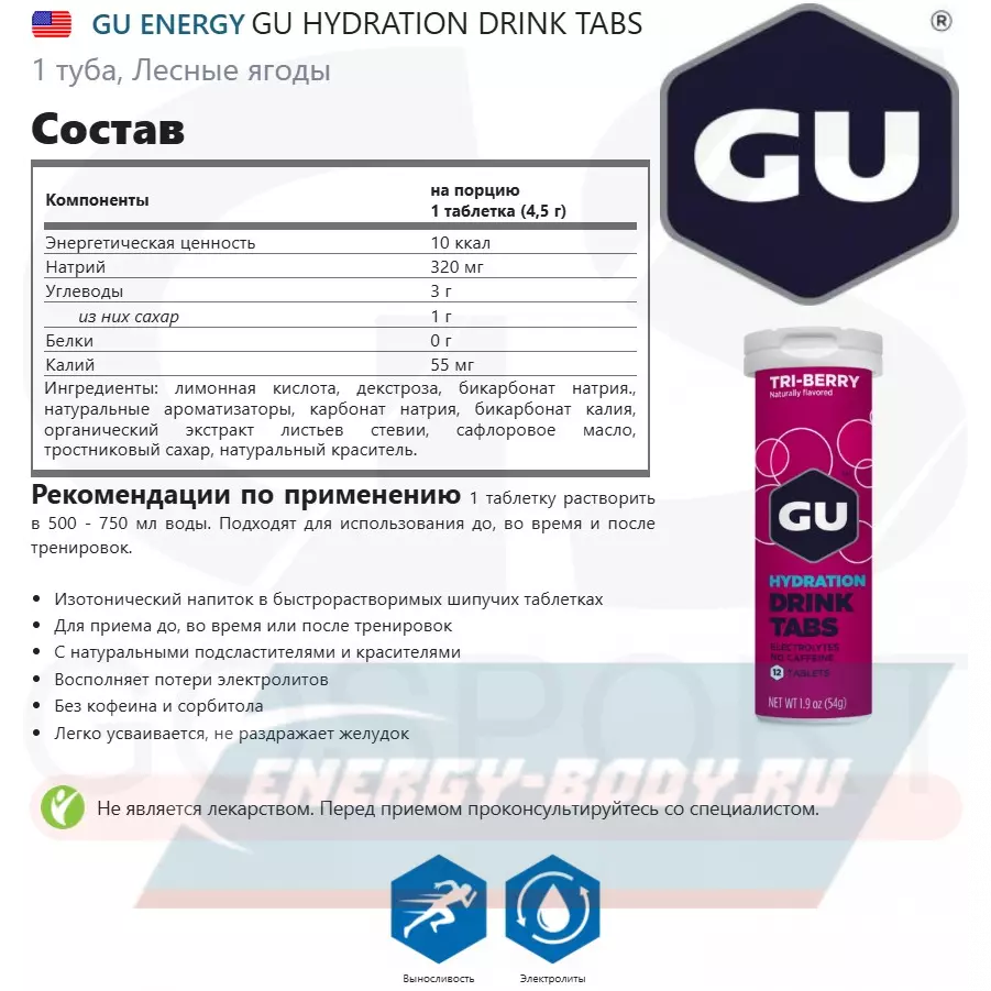 Hydration Drink Tabs от GU - это быстро растворимые шипучие таблетки, предназначенные для приготовления до 500 мл изотонического напитка, состав которого поможет нормализовать уровень электролитов в теле. Благодаря сохранению оптимального уровня гидратации, мы обеспечиваем условия, при которых организм может легче справляться с длительными физическими нагрузками. Следует также отметить, что данный изотоник характеризуется щадящим действием на ЖКТ, не вызывая раздражение желудка в процессе усвоения.