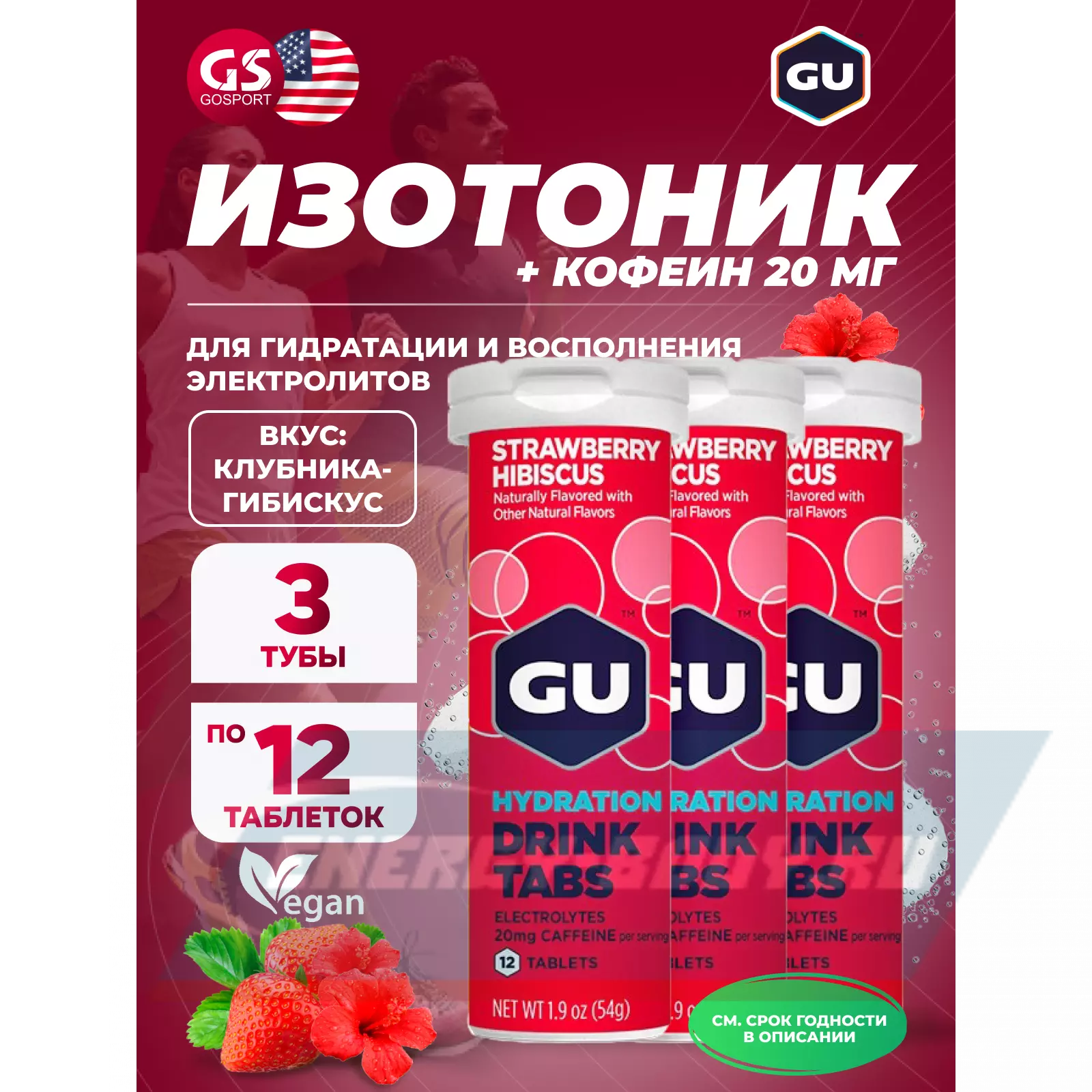 GU HYDRATION DRINK TABS + caffeine 3 x 12 таб, Клубника-Гибискус