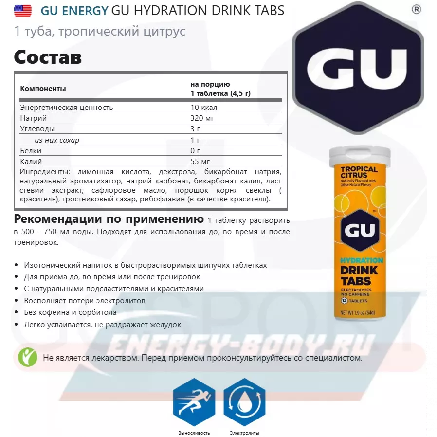 - Полное описание GU HYDRATION DRINK TABS + caffeine