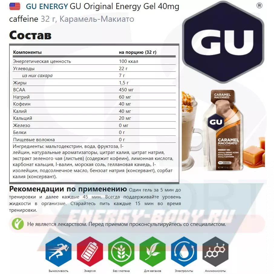 Созданный для ежедневных тренировок и соревнований, высококалорийный энергетический гель GU помогает поддерживать уровень энергии при продолжительной физической нагрузке. Пакет содержит 100 калорий, а углеводы (мальтодекстрин и фруктоза) используют не конкурирующие пути, чтобы помочь в обеспечении максимального углеводного поглощения и усваивания, одновременно не допуская проблем с желудком. Натрий, первичный электролит, теряющийся с потом, помогает поддерживать солевой баланс. Аминокислоты с разветвленной цепью (лейцин, валин, изолейцин), могут уменьшить умственную усталость и снизить риск повреждение мышц.