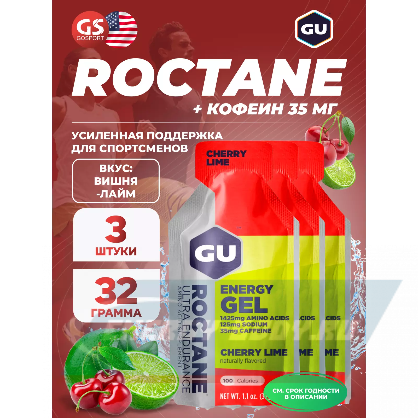 GU ENERGY GU ROCTANE Energy Gel 35mg caffeine 3 x 32 г, Вишня-Лайм — Для выносливости и водно-солевого баланса