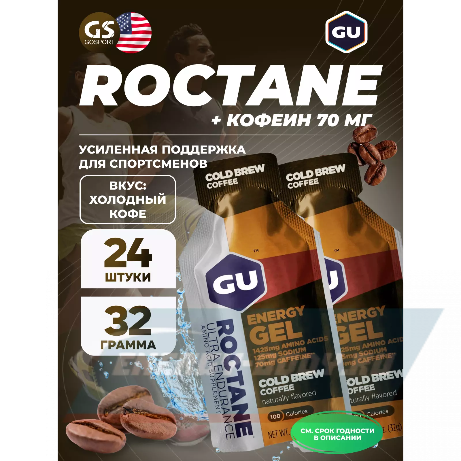 GU ENERGY GU ROCTANE Energy Gel 70mg caffeine 24 x 32 г, Холодный кофе — Для выносливости и водно-солевого баланса
