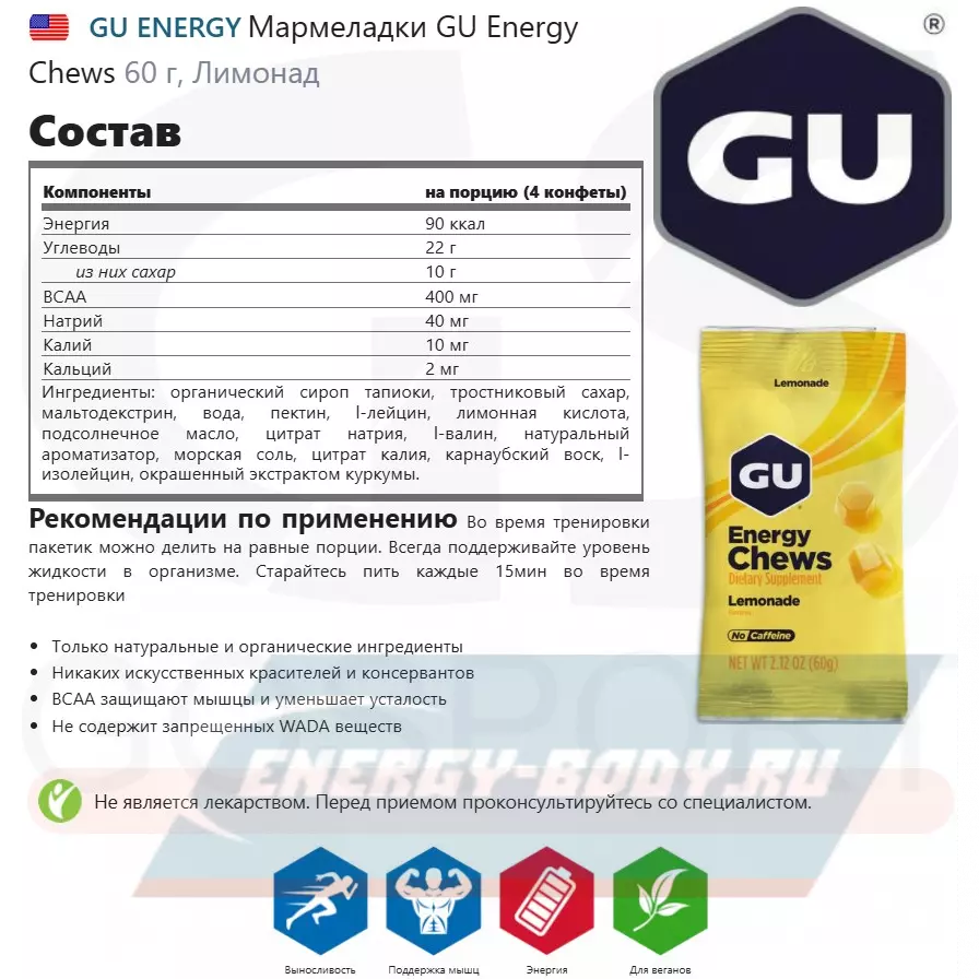 Жевательные конфеты с углеводами, электролитами и аминокислотами. Предназначены для пополнения организма энергией во время тренировок и соревнований. Содержат аминокислоты (лейцин, валин, изолейцин) для предотвращения повреждения мышц. Жевательные конфеты GU содержат в одной пачке 16 жевательных конфет внутри, как 2 полноценных геля GU Energy • Только натуральные и органические ингредиенты • Никаких искусственных красителей и консервантов • ВСАА (лейцин, валин, изолейцин) защищает мышцы и уменьшает усталость • В состав входит натрий (основной электролит) и калий • Не содержит запрещенных WADA веществ • Во время тренировки пакетик можно делить на равные порции. Всегда поддерживайте уровень жидкости в организме. Старайтесь пить каждые 15мин во время тренировки