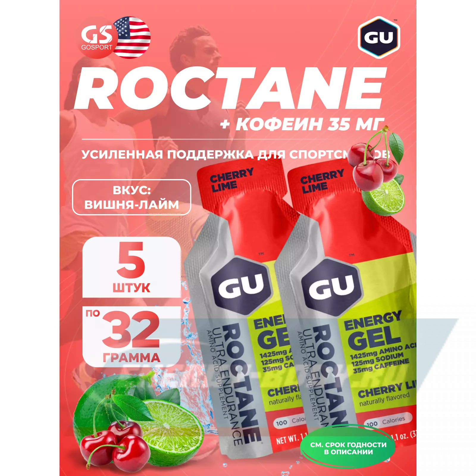 GU ENERGY GU ROCTANE Energy Gel 35mg caffeine 5 x 32 г, Вишня-Лайм — Для выносливости и водно-солевого баланса