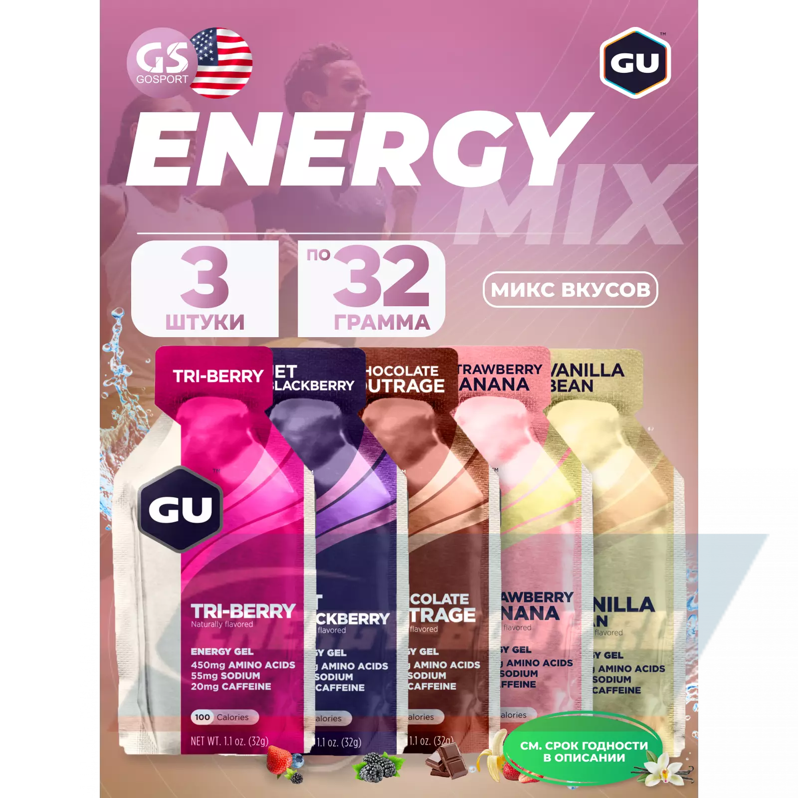Созданный для ежедневных тренировок и соревнований, высококалорийный энергетический гель GU помогает поддерживать уровень энергии при продолжительной физической нагрузке. Пакет содержит 100 калорий, а углеводы (мальтодекстрин и фруктоза) используют не конкурирующие пути, чтобы помочь в обеспечении максимального углеводного поглощения и усваивания, одновременно не допуская проблем с желудком. Натрий, первичный электролит, теряющийся с потом, помогает поддерживать солевой баланс. Аминокислоты с разветвленной цепью (лейцин, валин, изолейцин), могут уменьшить умственную усталость и снизить риск повреждение мышц.
