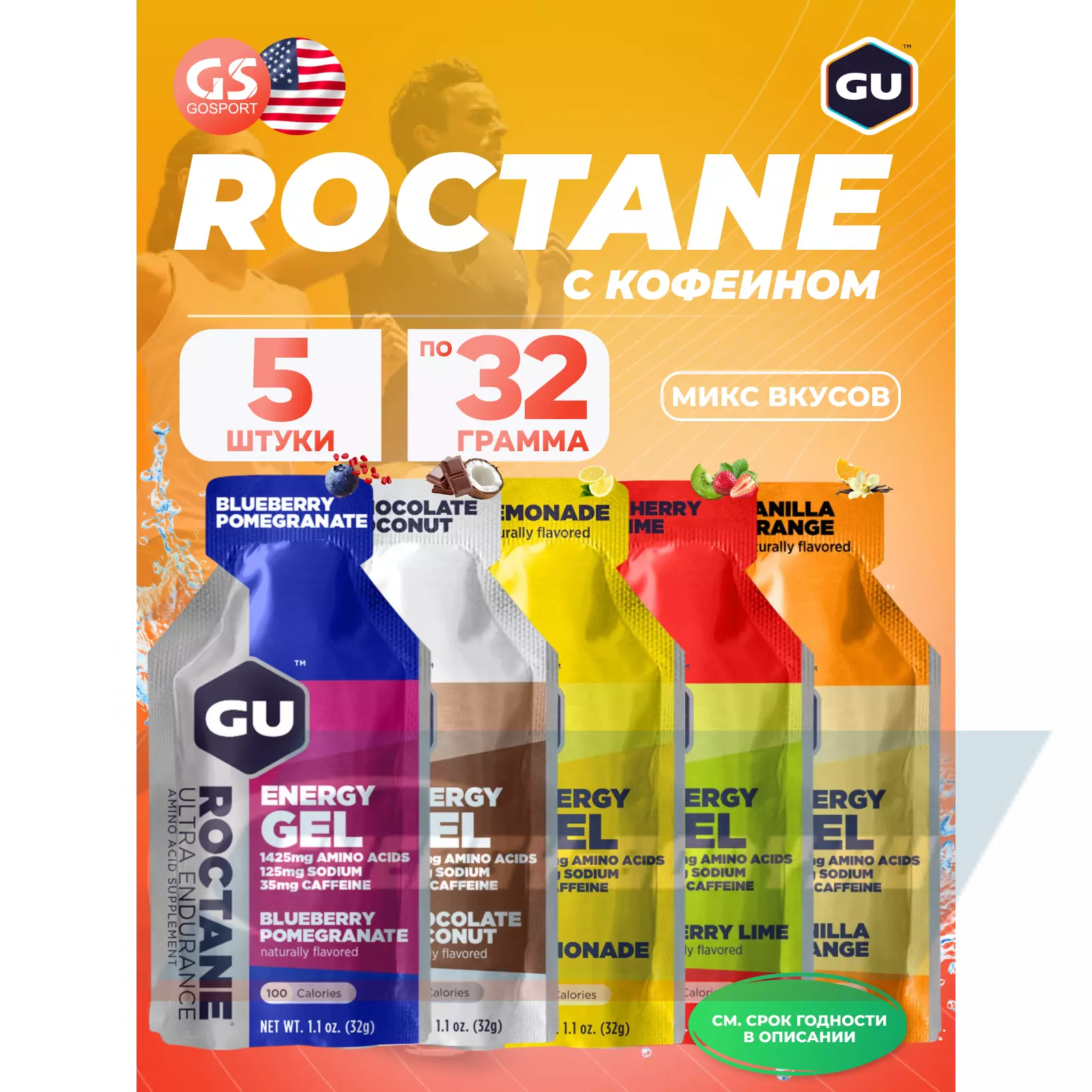 GU Energy Labs GU ROCTANE ENERGY GEL 35mg caffeine Микс, 5 x 32 г (5 вкусов) — Для выносливости и водно-солевого баланса