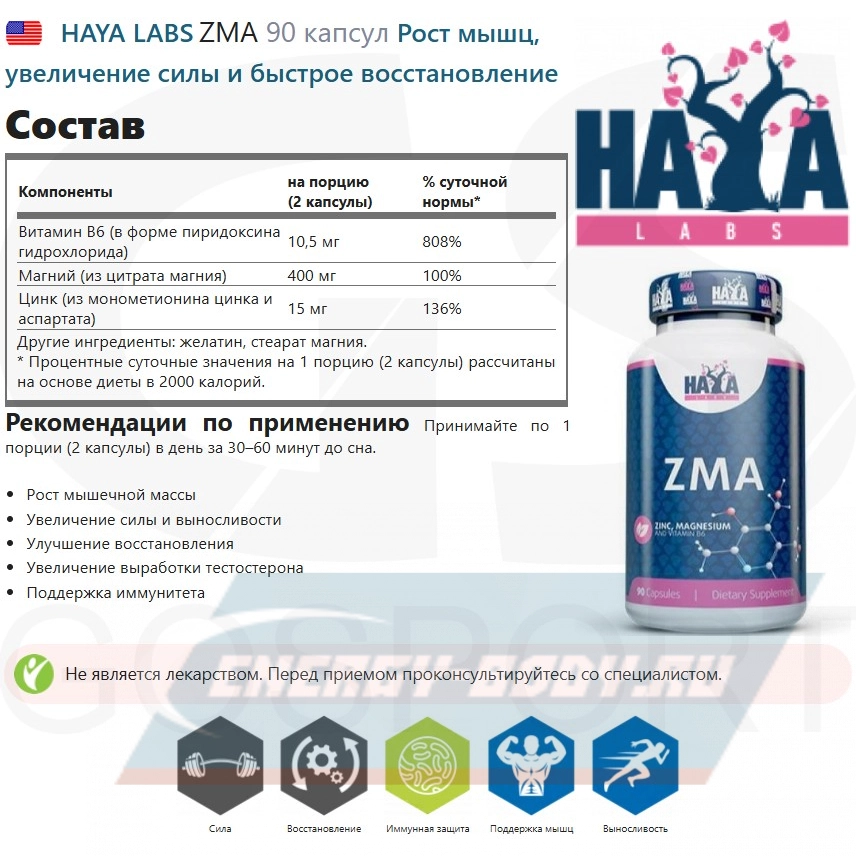 Haya Labs ZMA (цинк, магний и витамин B6) выпускается в упаковках по 90 капсул, по 15 мг цинка, 400 мг магния и 10,5 мг витамина B6 на порцию. Рекомендуемая доза — 2 капсулы один раз в день.