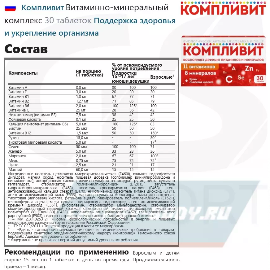 Ингредиенты: носитель целлюлоза микрокристаллическая (Е460i), кальция гидрофосфата дигидрат, магния оксид, носитель пищевая добавка [сополимер винилпирролидона и винилацетата], аскорбиновая кислота, железа сульфата гептагидрат, рутин, цинка сульфата гептагидрат, стабилизатор поливинилпирролидон (Е1201), загуститель гидроксипропилцеллюлоза (Е463), носитель кроскармелоза натрия (Е468), агент антислеживающий кальция стеарат (Е470), никотинамид, краситель титана диоксид (Е171), агент антислеживающий тальк (Е553), марганца сульфата моногидрат, кальция пантотенат, тиоктовая (липоевая) кислота, ретинола ацетат, глазирователь полиэтиленгликоль (Е1521), α-токоферола ацетат, меди сульфат, пиридоксина гидрохлорид, агент антислеживающий кремния диоксид (Е551), рибофлавин, стабилизатор мальтодекстрин, стабилизатор модифицированный пищевой крахмал картофельный, тиамина гидрохлорид, эмульгатор полисорбат 80 (Твин 80) (Е433), наполнитель этилцеллюлоза (Е462), глазирователь воск карнаубский (Е903), селенит натрия, фолиевая кислота, биотин, цианокобаламин.