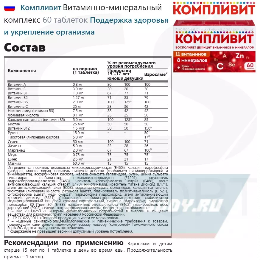 Компливит Витаминно-минеральный комплекс, содержит 21 компонент для поддержания здоровья и укрепления всего организма.