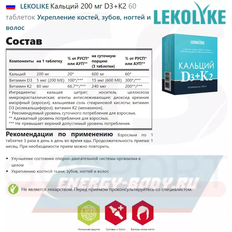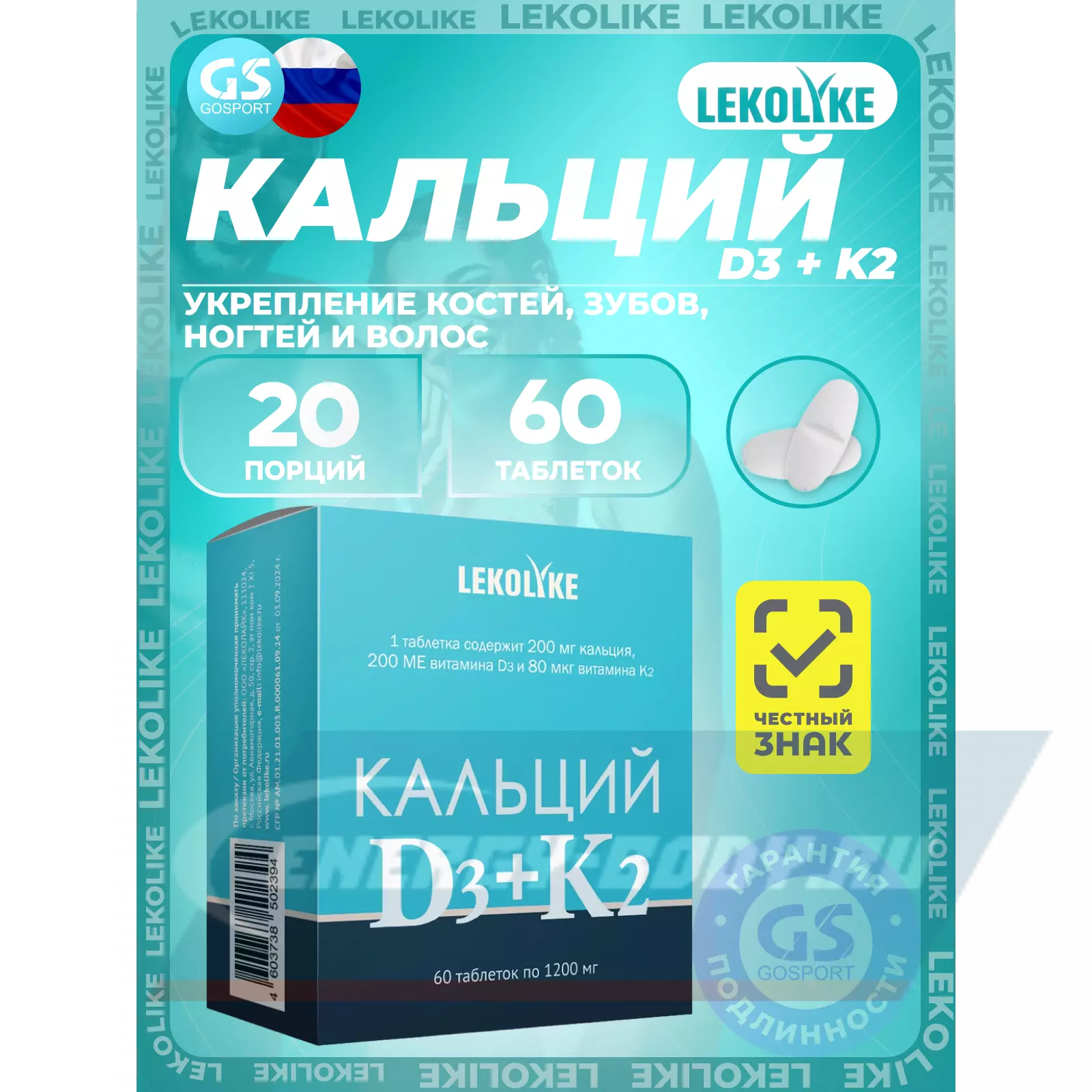 LEKOLIKE Кальций 200 мг D3+K2 60 таблеток — Укрепление костей, зубов, ногтей и волос