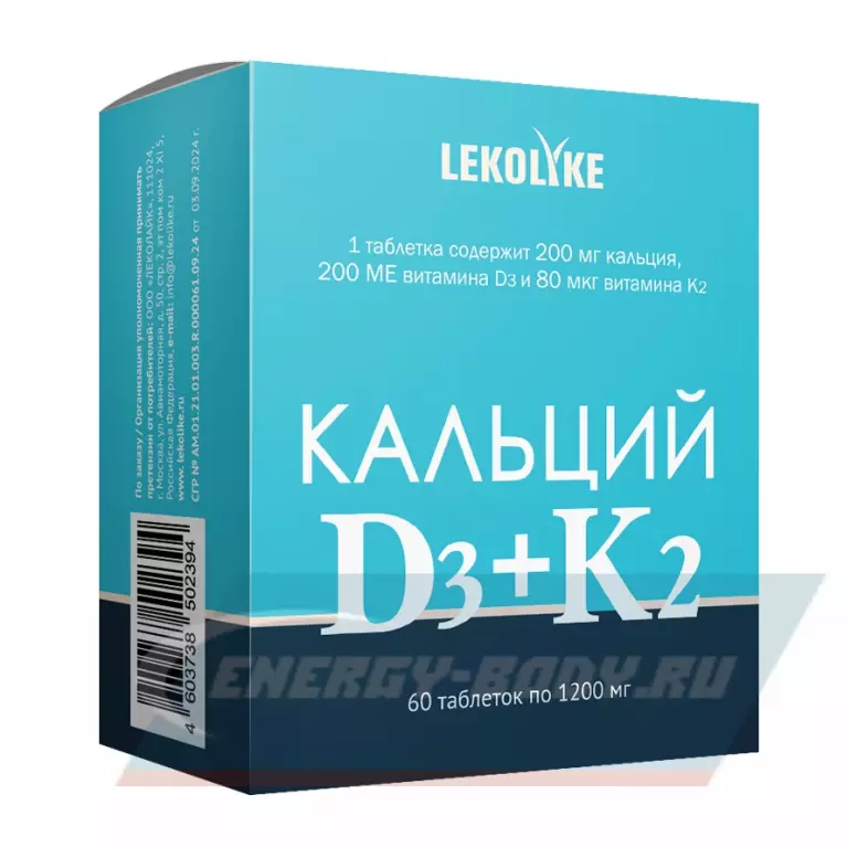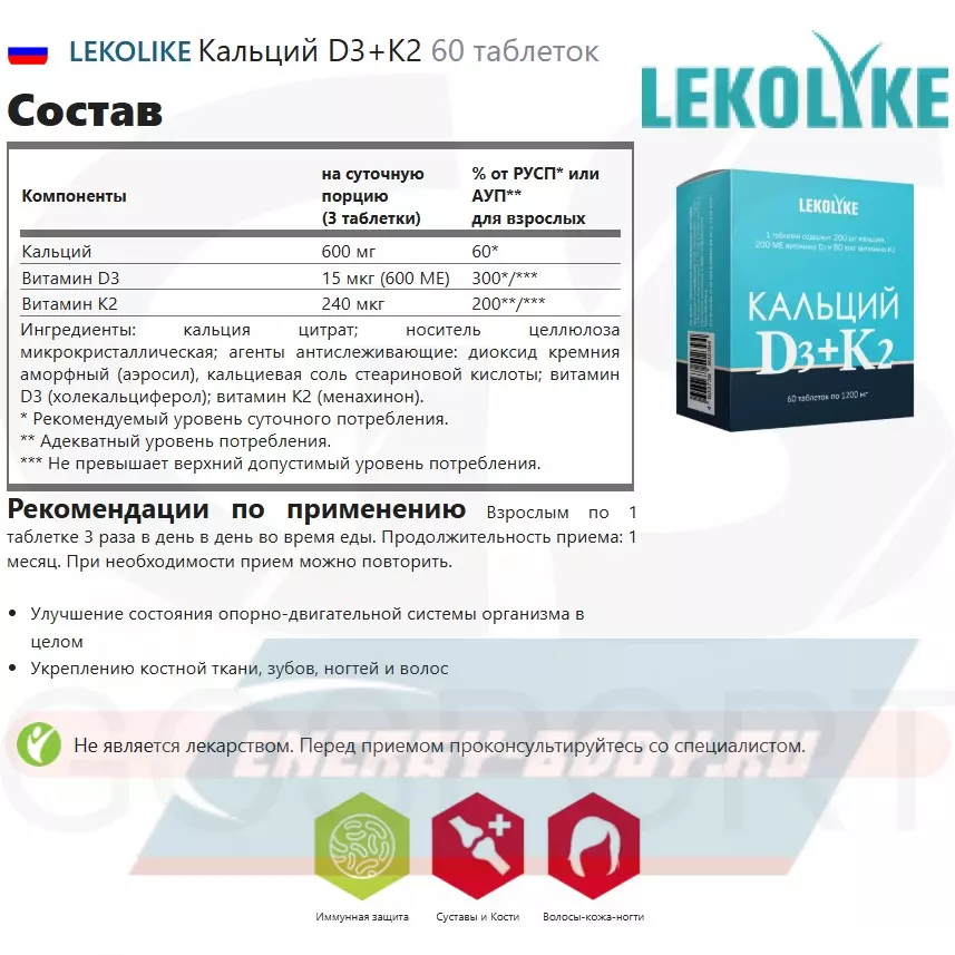 КАЛЬЦИЙ D3+K2 от компании ЛЕКОЛАЙК разработана для поддержания здоровья костей и суставов, ногтей и волос.
