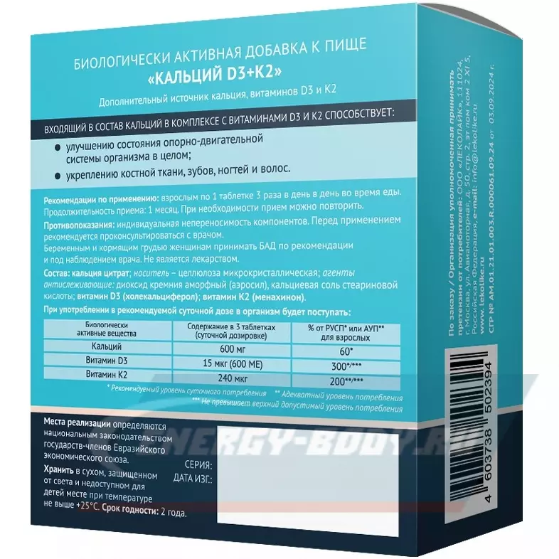 Витамин D3 помогает организму лучше усваивать кальций и обеспечивает нормальный рост и развитие костной ткани, а витамин K2 направляет кальций в костные ткани, предотвращая отложения кальция в сосудах и органах.