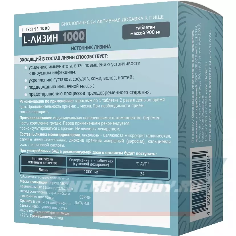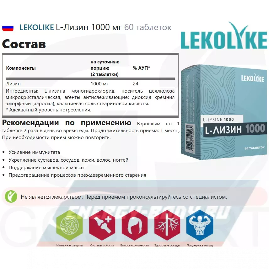LEKOLIKE L-Лизин 1000 мг 60 таблеток — Укрепление иммунитета, суставов, сосудов и волос