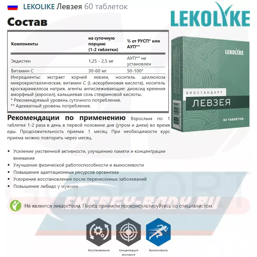 Ингредиенты: экстракт корней левзеи, носитель целлюлоза микрокристаллическая, витамин С (L-аскорбиновая кислота), носитель кроскарамеллоза натрия, агенты антислеживающие: диоксид кремния аморфный (аэросил), кальциевая соль стеариновой кислоты.