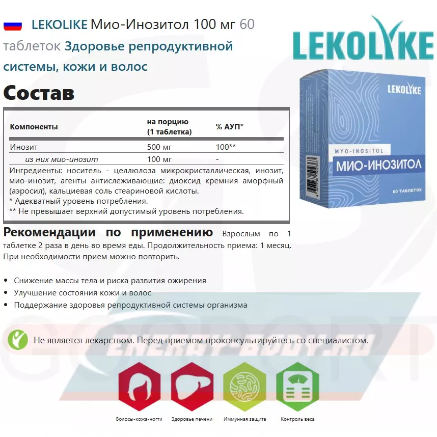 LEKOLIKE Мио-Инозитол 100 мг 60 таблеток — Здоровье репродуктивной системы, кожи и волос