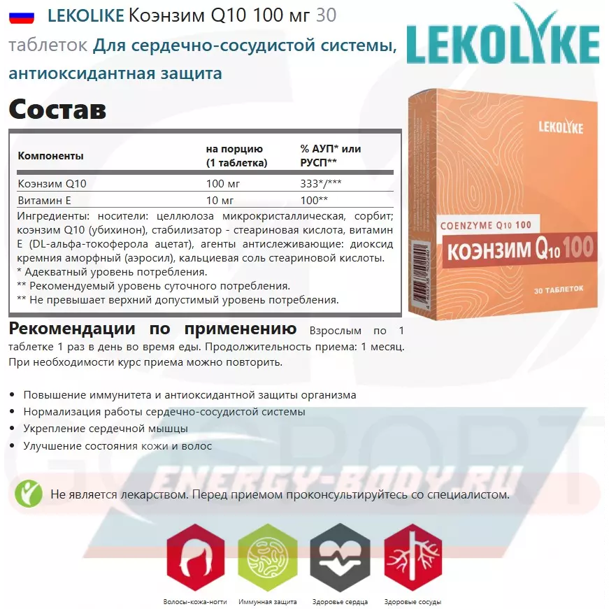 LEKOLIKE Коэнзим Q10 100 мг 30 таблеток — Для сердечно-сосудистой системы, антиоксидантная защита