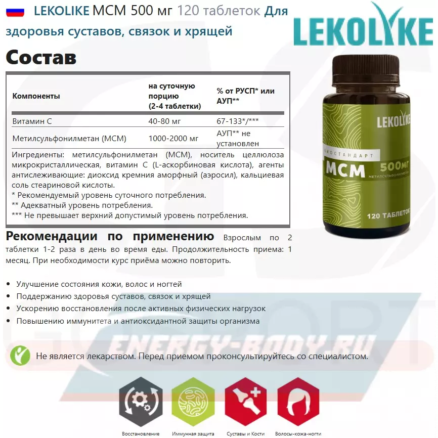 Ингредиенты: метилсульфонилметан (МСМ), носитель целлюлоза микрокристаллическая, витамин С (L-аскорбиновая кислота), агенты антислеживающие: диоксид кремния аморфный (аэросил), кальциевая соль стеариновой кислоты.