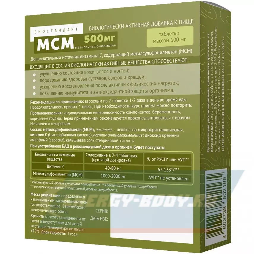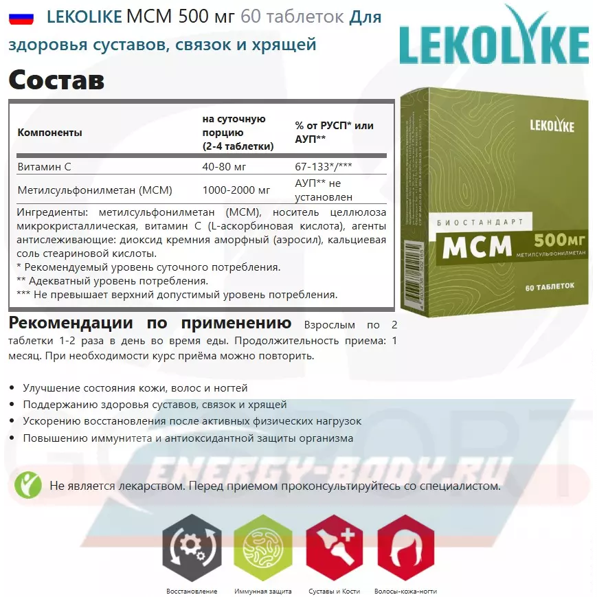 Ингредиенты: метилсульфонилметан (МСМ), носитель целлюлоза микрокристаллическая, витамин С (L-аскорбиновая кислота), агенты антислеживающие: диоксид кремния аморфный (аэросил), кальциевая соль стеариновой кислоты.