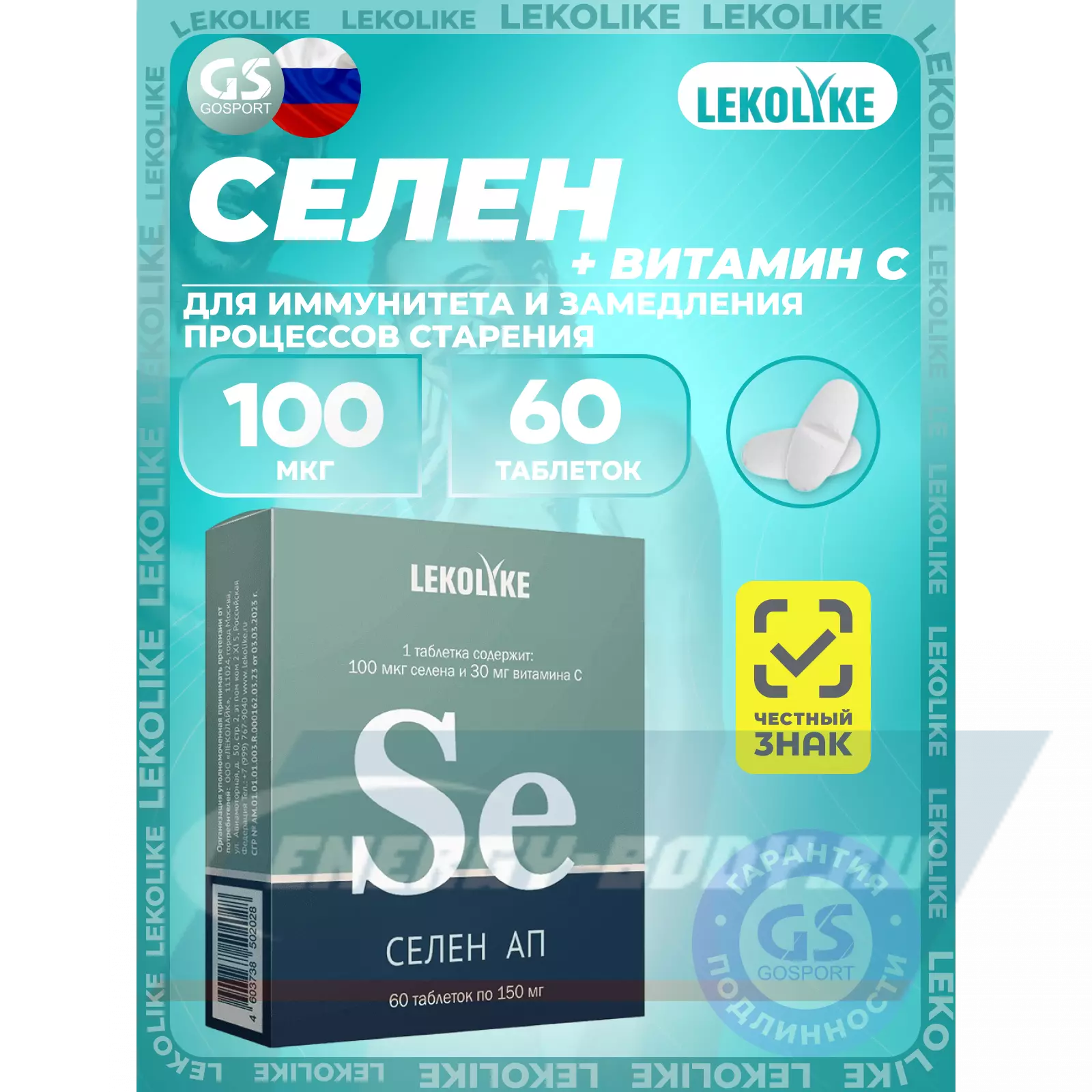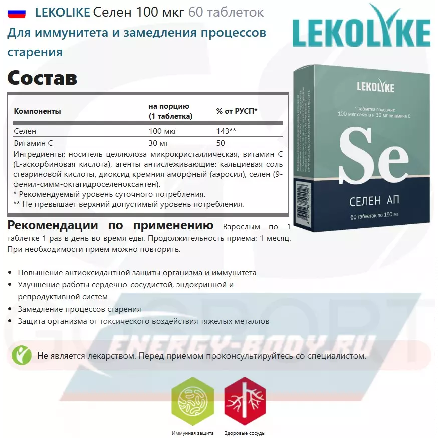 Ингредиенты: носитель целлюлоза микрокристаллическая, витамин С (L-аскорбиновая кислота), агенты антислеживающие: кальциевая соль стеариновой кислоты, диоксид кремния аморфный (аэросил), селен (9-фенил-симм-октагидроселеноксантен).