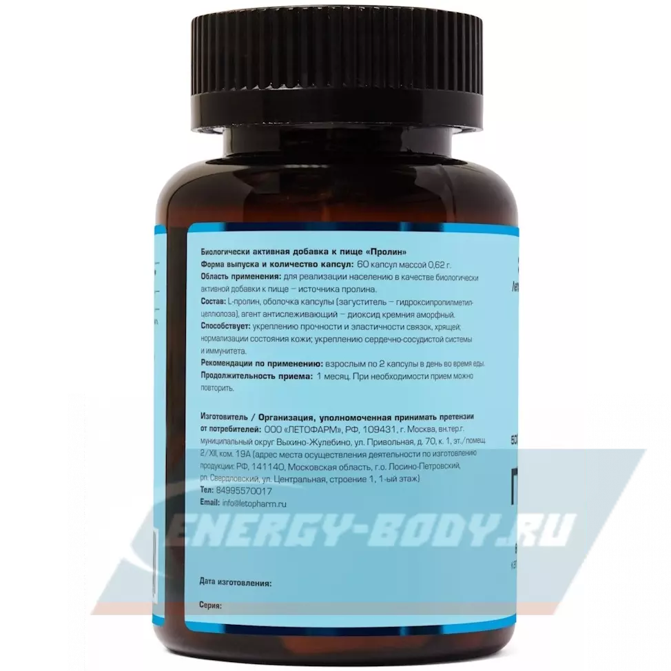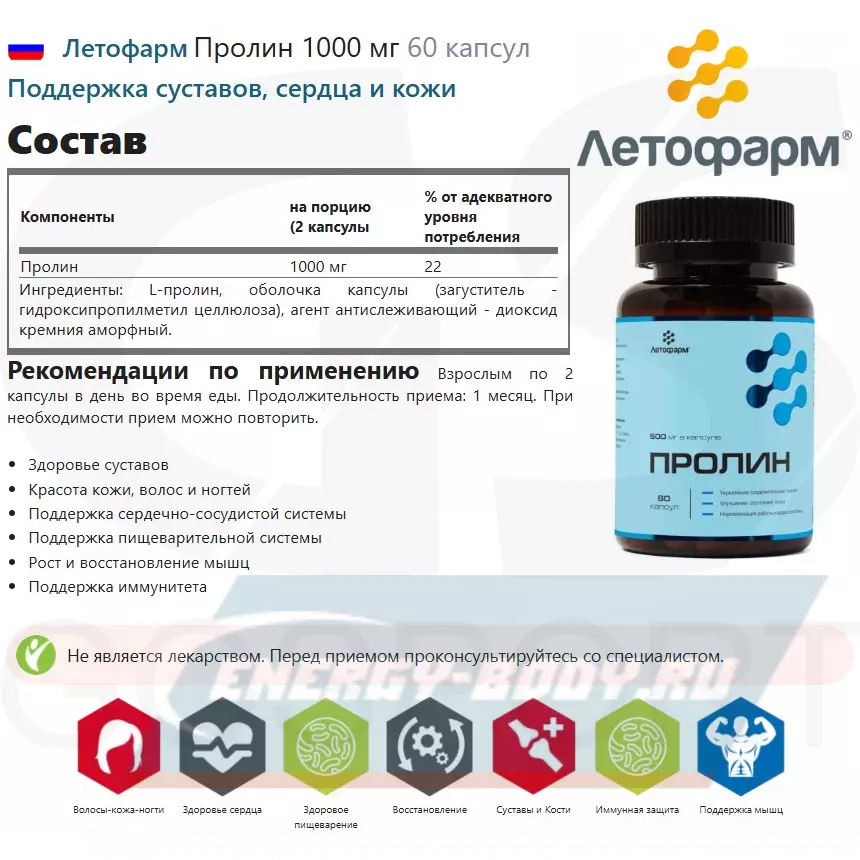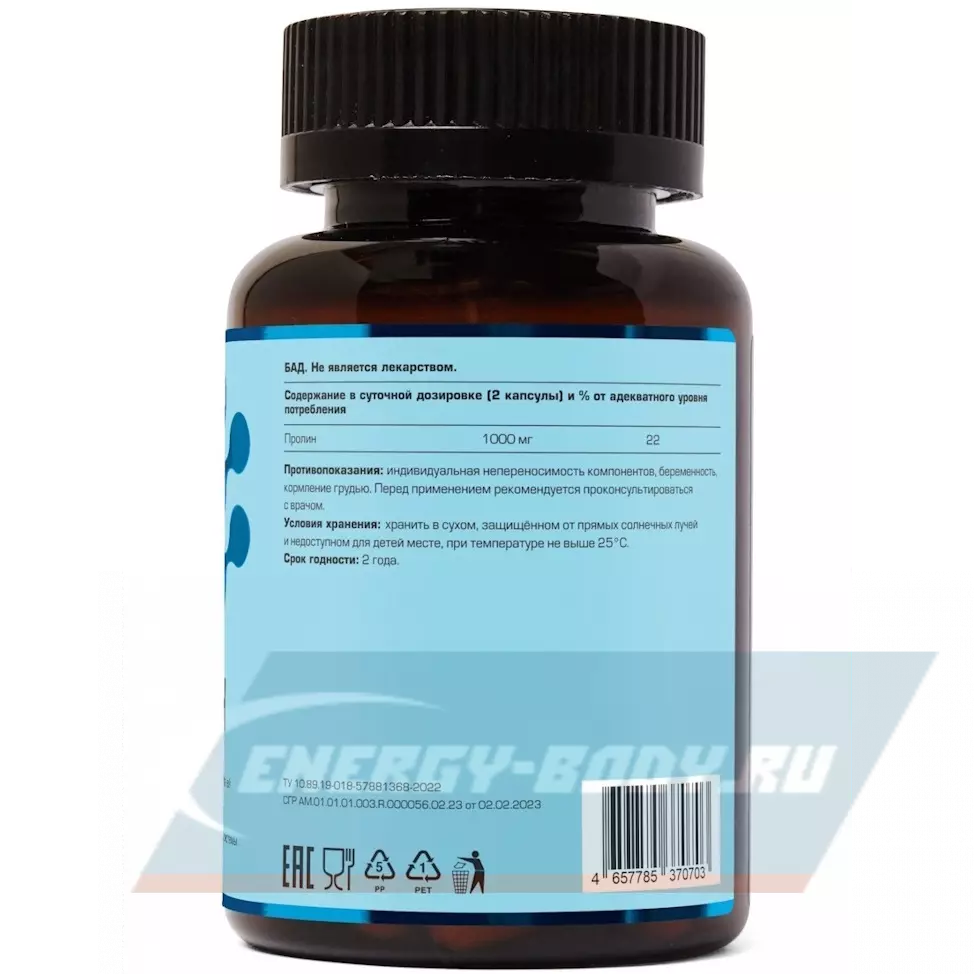 Ингредиенты: L-пролин, оболочка капсулы (загуститель - гидроксипропилметил целлюлоза), агент антислеживающий - диоксид кремния аморфный.
