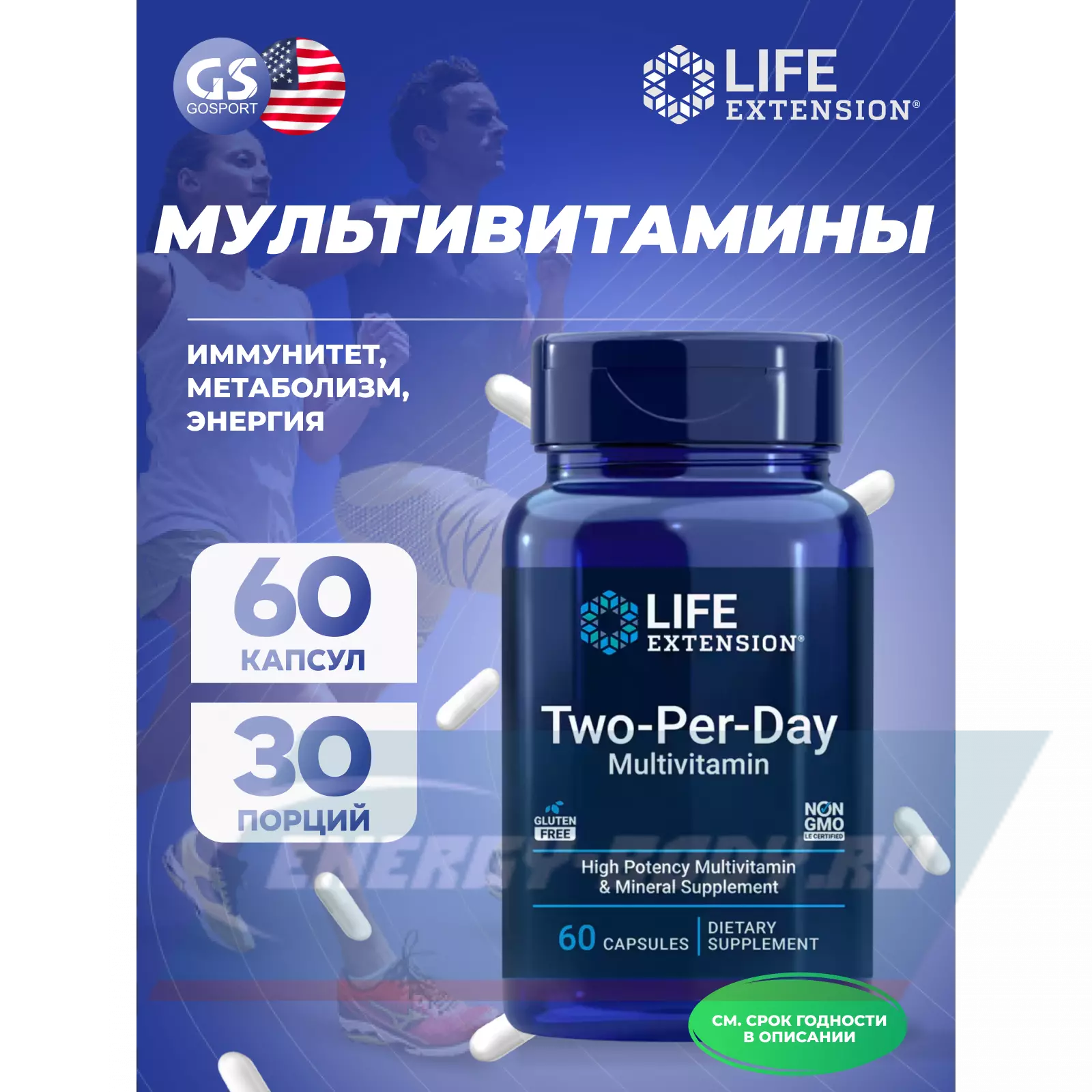 Капсулы Two-Per-Day Multivitamin от Life Extension для приема дважды в день, без сои, содержат биоактивную форму фолата (витамина группы B), 5-МТГФ, кверцетин, цитрат цинка, смешанную токоферольную форму витамина E и другие ингредиенты.