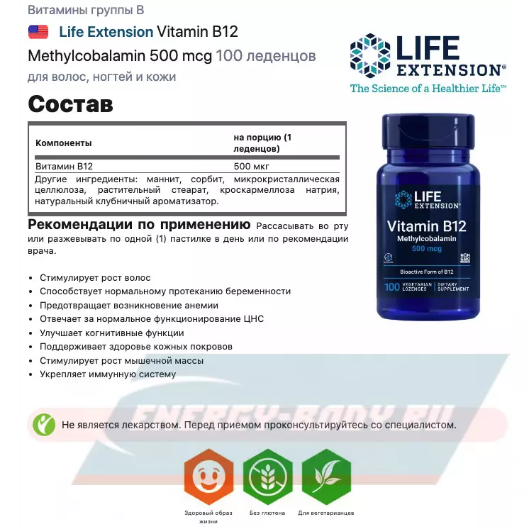 Состав Life Extension Vitamin B12 Methylcobalamin 500 mcg