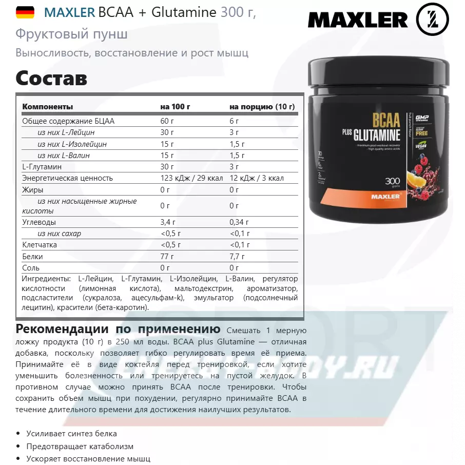 Поскольку Глутамин и БЦАА аминокислоты, которые играют важную роль в восстановлении мышц, то продукт Maxler BCAA+Glutamine отличная добавка для любого атлета.Данный продукт снабжает организм самой распространенной аминокислотой в организме человека - Глутамином, а также незаменимыми аминокислотами с разветвленными цепями – Лейцином, Валином и Изолейцином. Глутамин защищает мышцы от катаболизма, помогая нарастить и сохранить мышечную массу. BCAA играют важную роль в росте и развитии мышц, а также способствуют быстрому восстановлению после интенсивных физических нагрузок.