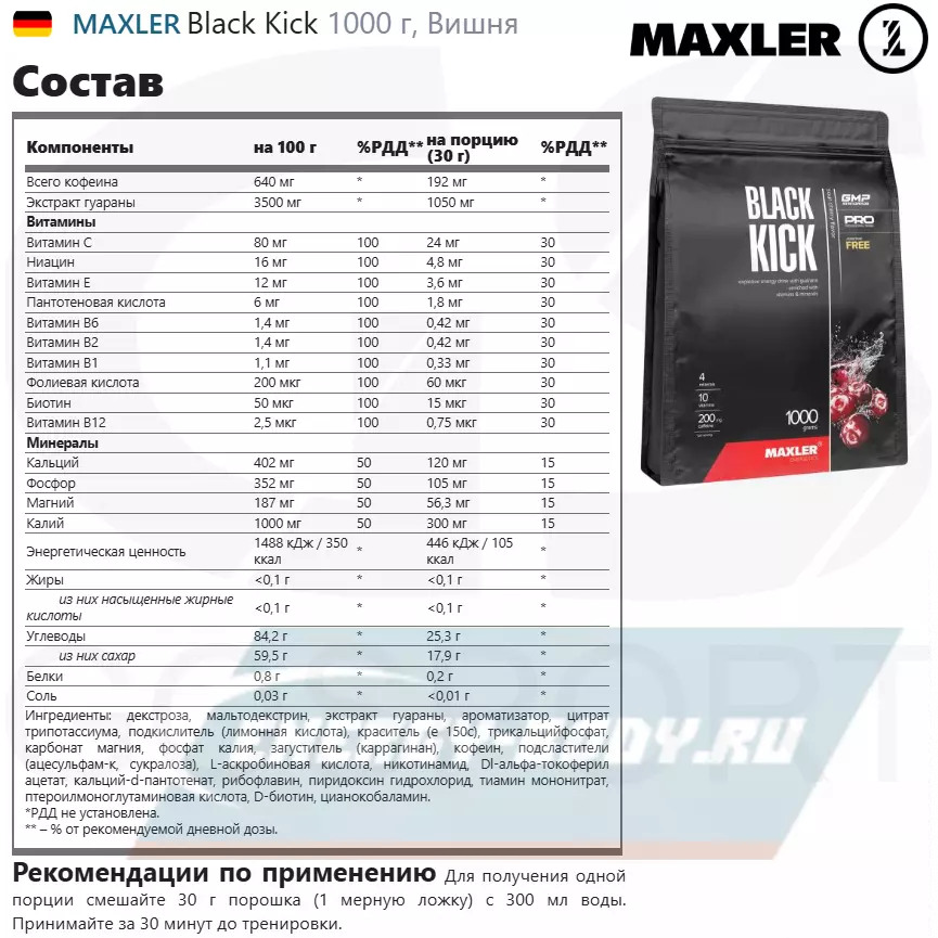 Black Kick – энергетический кофеино-гуарановый продукт на углеводной основе с витаминами и минералами. Стимулирующий эффект Black Kick обеспечивается высоким содержанием кофеина и гуараны. Экстракт гуараны – источник кофеина растительного происхождения. Сочетание чистого кофеина (быстрое воздействие на организм) с экстрактом гуараны (замедленное воздействие) обеспечивает интенсивное и длительное действие продукта. Прием Black Kick перед тренировкой и во время физических упражнений ускоряет кровообращение, стимулирует работоспособность, выносливость, помогает бороться с усталостью, улучшает концентрацию и обеспечивает готовность к запредельным нагрузкам. Продукт рекомендован для игровых, силовых видов спорта, занятий фитнесом, а также для людей, ведущих активный образ жизни.