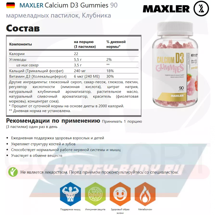 Calcium D3 gummies от MAXLER - это сбалансированная и полноценная формула важнейших минералов для ежедневной поддержки здоровья взрослых и детей.