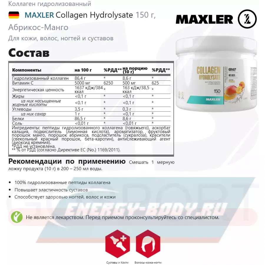 Maxler разработал продукт Collagen Hydrolysate, содержащий эффективную форму коллагена - гидролизованный коллаген. Гидролизованный коллаген способствует улучшению структуры кожи, волос и ногтей, важен для поддержания здоровья костей и суставов, облегчает регенерацию тканей после повреждений.