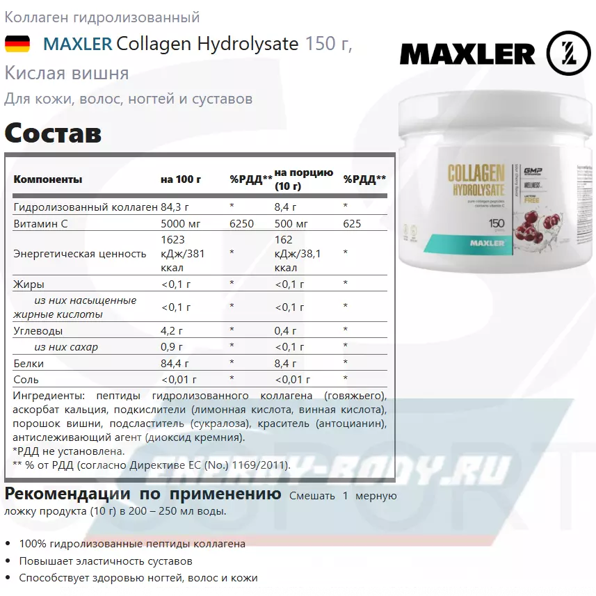 Maxler разработал продукт Collagen Hydrolysate, содержащий эффективную форму коллагена - гидролизованный коллаген. Гидролизованный коллаген способствует улучшению структуры кожи, волос и ногтей, важен для поддержания здоровья костей и суставов, облегчает регенерацию тканей после повреждений.