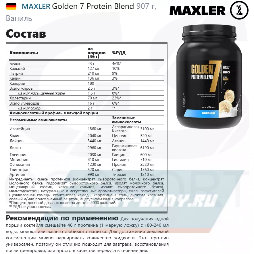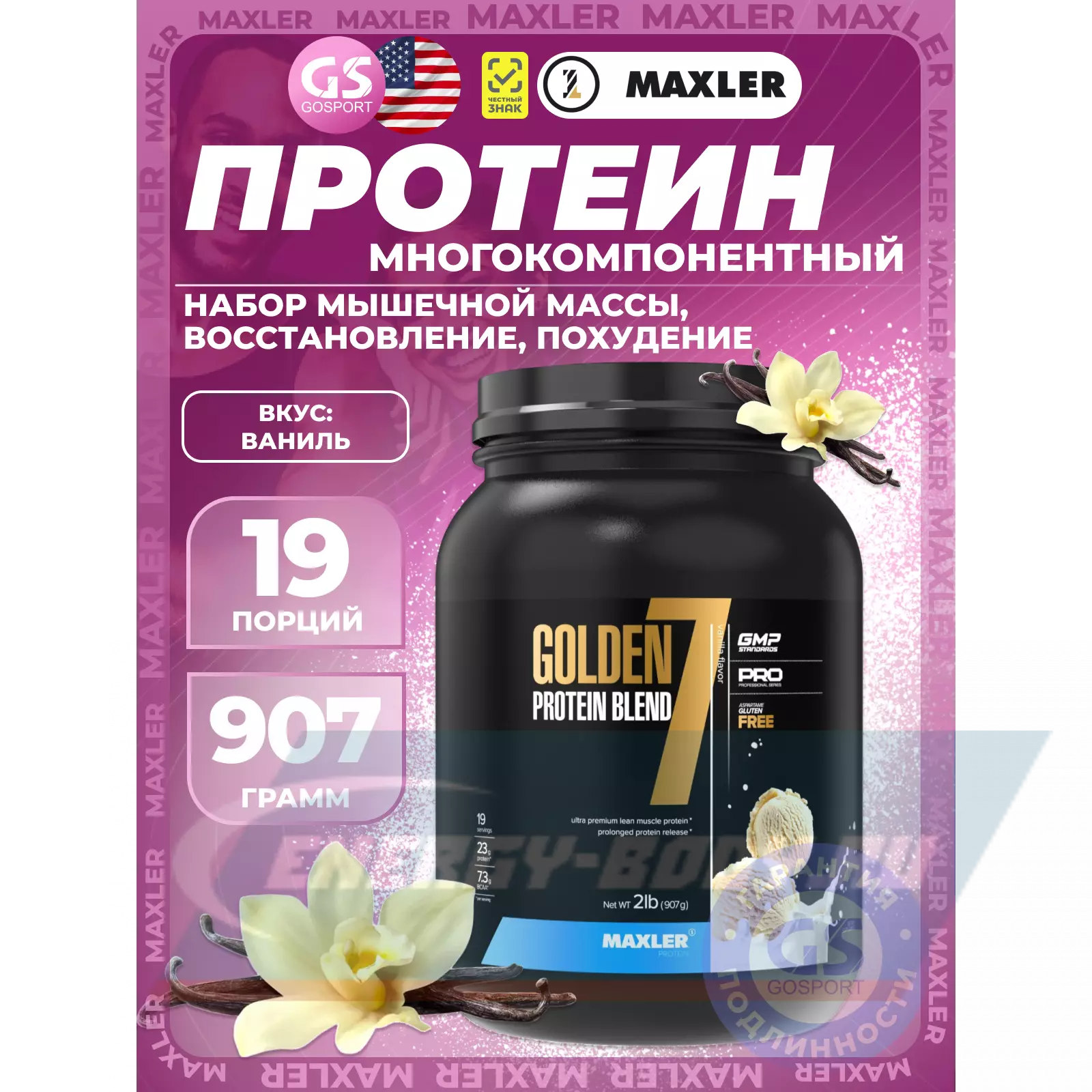 Golden 7 — эффективная многокомпонентная белковая смесь (концентрат сывороточного белка, концентрат молочного белка, гидролизат сывороточного белка, изолят молочного белка, казеинат кальция и изолят сывороточного белка).