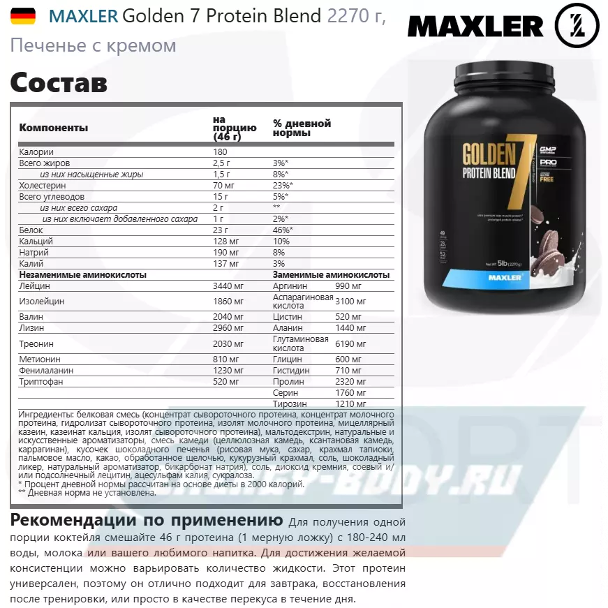 Golden 7 — эффективная многокомпонентная белковая смесь (концентрат сывороточного белка, концентрат молочного белка, гидролизат сывороточного белка, изолят молочного белка, казеинат кальция и изолят сывороточного белка).
