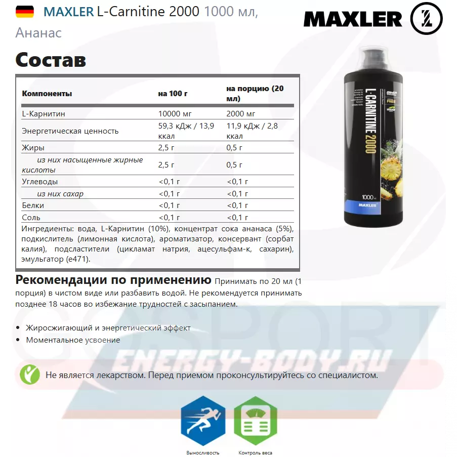 Ингредиенты: вода, L-Карнитин (10%), концентрат сока ананаса (5%), подкислитель (лимонная кислота), ароматизатор, консервант (сорбат калия), подсластители (цикламат натрия, ацесульфам-к, сахарин), эмульгатор (e471).