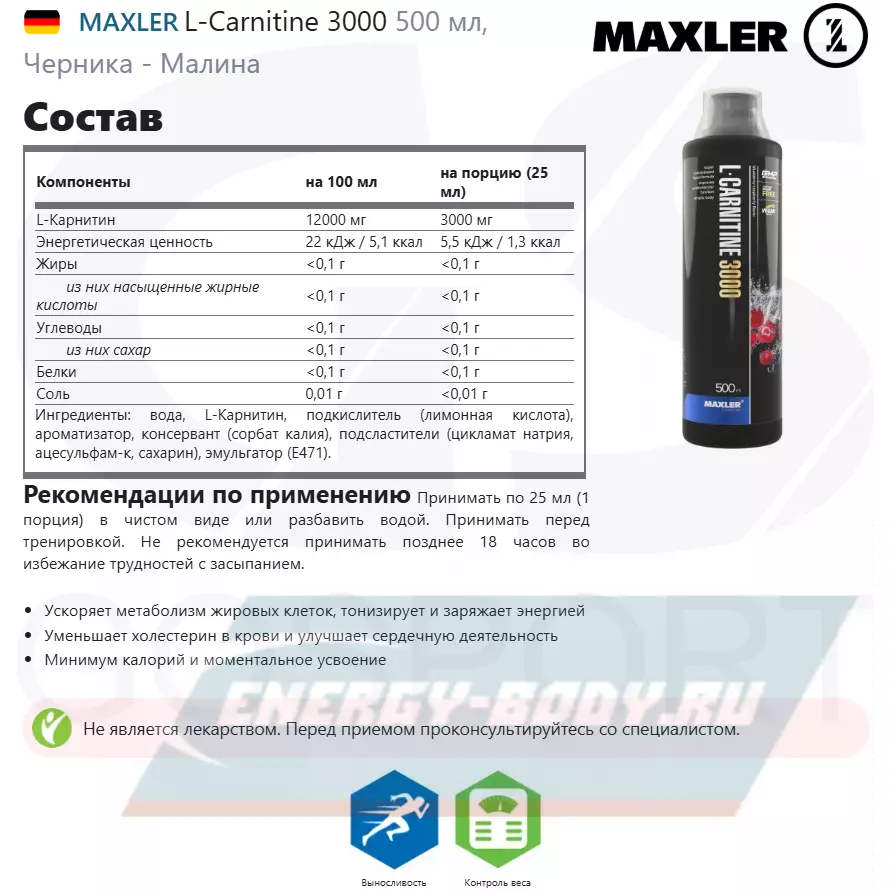 Ингредиенты: вода, L-Карнитин, подкислитель (лимонная кислота), ароматизатор, консервант (сорбат калия), подсластители (цикламат натрия, ацесульфам-к, сахарин), эмульгатор (Е471).