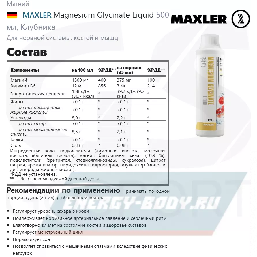 Ингредиенты: вода, подкислители (лимонная кислота, молочная кислота, яблочная кислота), магния бисглицинат хелат (10,9 %), подсластители (эритритол, стевиолгликозиды, сукралоза), цитрат натрия, ароматизатор, пиридоксина гидрохлорид, эмульгатор (моно- и диглицериды жирных кислот).